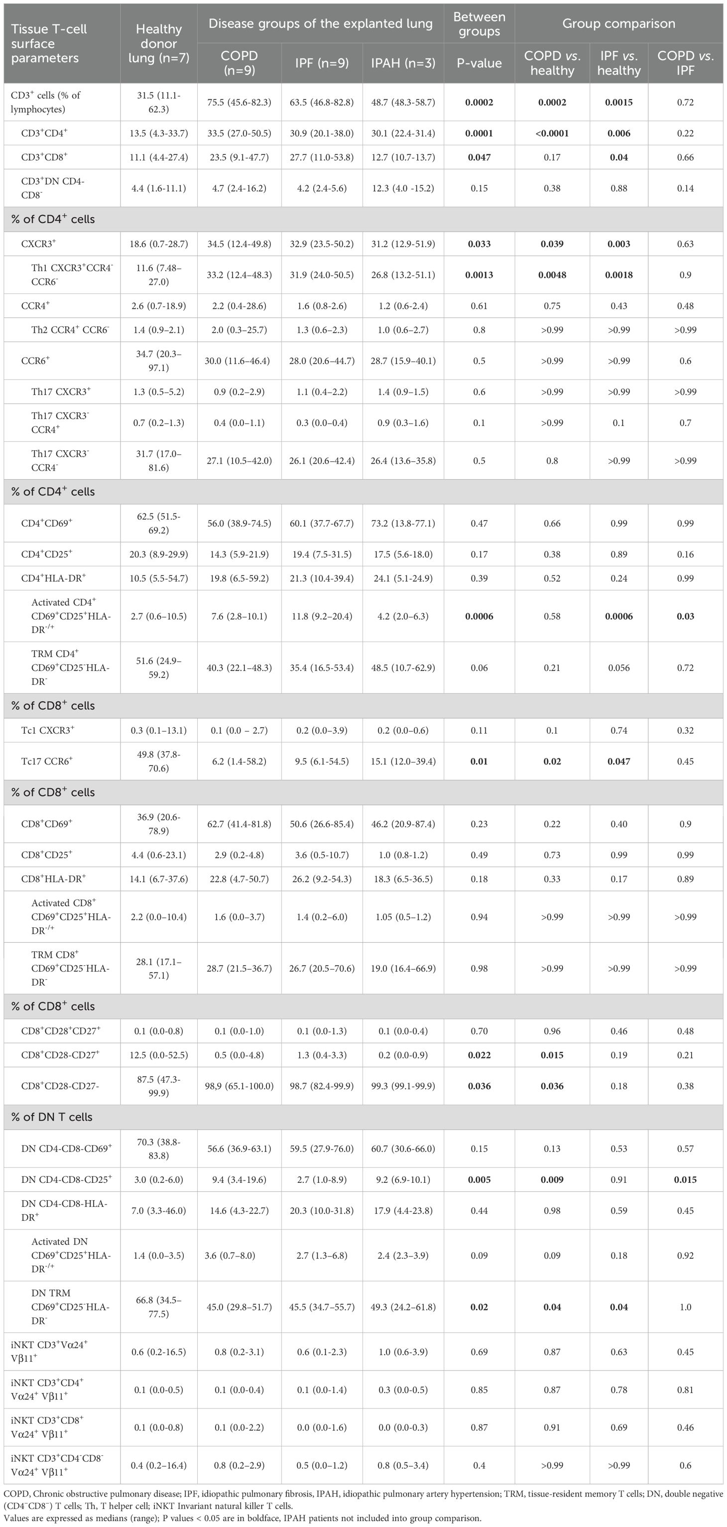 Lung transplantation is the only intervention shown to increase life expectancy and quality of life in patients with IPF (17) and end-stage COPD, and it is the final treatment option for selected patients (18). Our study aimed to analyze lung tissue lymphocyte subpopulations of COPD and IPF patients undergoing lung transplantation and compare them to those in the lung from pre-transplant donor lungs. Additionally, we included lung samples from a small group of individuals with advanced medically refractory idiopathic pulmonary artery hypertension (IPAH) undergoing lung transplantation. In these patients, the role of adaptive immunity, particularly T lymphocytes, remains largely unknown, with minimal data available.