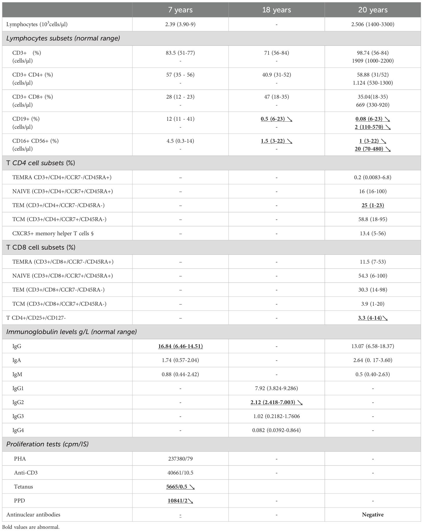 Extended immunophenotyping of PBMCs was performed and revealed a reduced percentage of TH17 cells compared to healthy controls (Figure 2D). During follow-up at the age of 20, immunophenotyping revealed significant B cell lymphopenia despite normal immunoglobulin levels, along with a reduced Natural Killer (NK) cells count (Table 1).