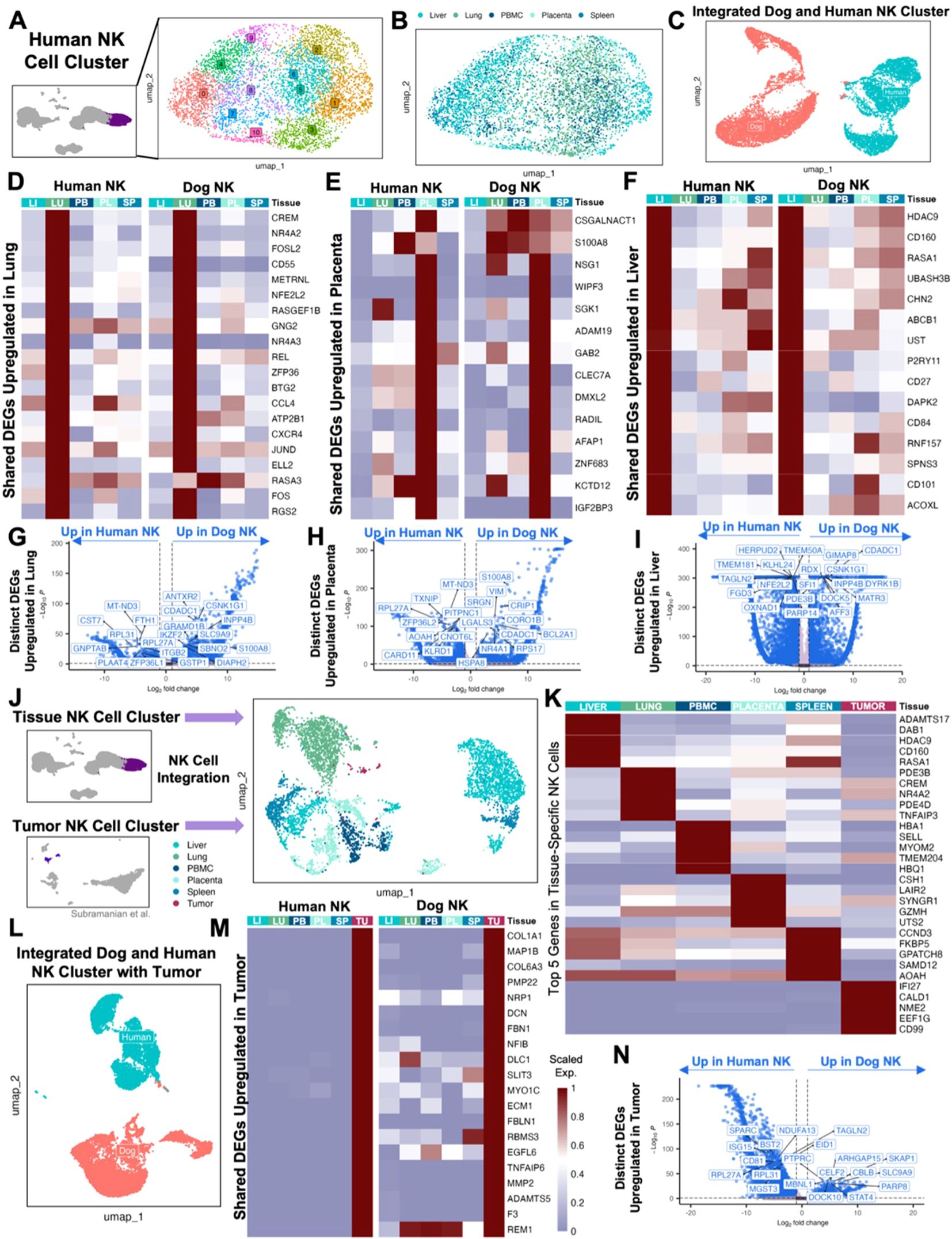 Figure 2. Canine and human NK cells show homology across blood, tissue, and tumor compartments. (A) UMAP representation of NK cells subset from the integrated liver, lung, placenta, and spleen dataset with 11 clusters identified by unsupervised clustering. (B) UMAP visualization of NK cells color coded by tissue with clustering parameters: res = 1, dims = 1:17. (C) NK cells from liver, lung, PBMC, placenta, and spleen tissue in both humans and dogs were integrated and visualized by UMAP, color coded by species. (D-F) Genes that were significantly upregulated in NK cells within each tissue compared to NK cells in the remaining tissues within each species with adjusted p-value<0.05 and average log2FC>1 were identified. The average expression of representative genes that were upregulated in both human and dog (D) lung, (E) placenta, and (F) liver NK cells were visualized by heatmap. (G-I) Volcano plots with labels for the top ten significant genes sorted by adjusted p value that had expression in at least 10% of cells in both tissues being compared and a log2FC>1 that differentiate human and canine NK cells in the (G) lung, (H) placenta, and (I) liver based on direct DEG comparisons. (J) NK cells subset from the integrated human tissue dataset and NK cells subset from a publicly available human UPS sample were integrated and visualized by UMAP color coded by tissue with clustering parameters: res = 1, dims = 1:20. (K) Heatmap showing the average expression of the top differentially expressed genes in NK cells from each tissue that distinguish them from NK cells in all other tissues. (L) NK cells from liver, lung, PBMC, placenta, spleen, and tumor tissue in both humans and dogs were integrated and visualized by UMAP, color coded by species. (M) Genes that were significantly upregulated in tumor NK cells compared to the NK cells in the remaining tissues within each species with adjusted p-value<0.05, average log2FC>1, and at least 10% expression in both tissues were identified. The average expression of genes that were upregulated in both human and dog tumor NK cells were visualized by heatmap. (N) Volcano plot with labels for the top ten significant genes that differentiate human and canine NK cells in tumor based on direct DEG comparisons.