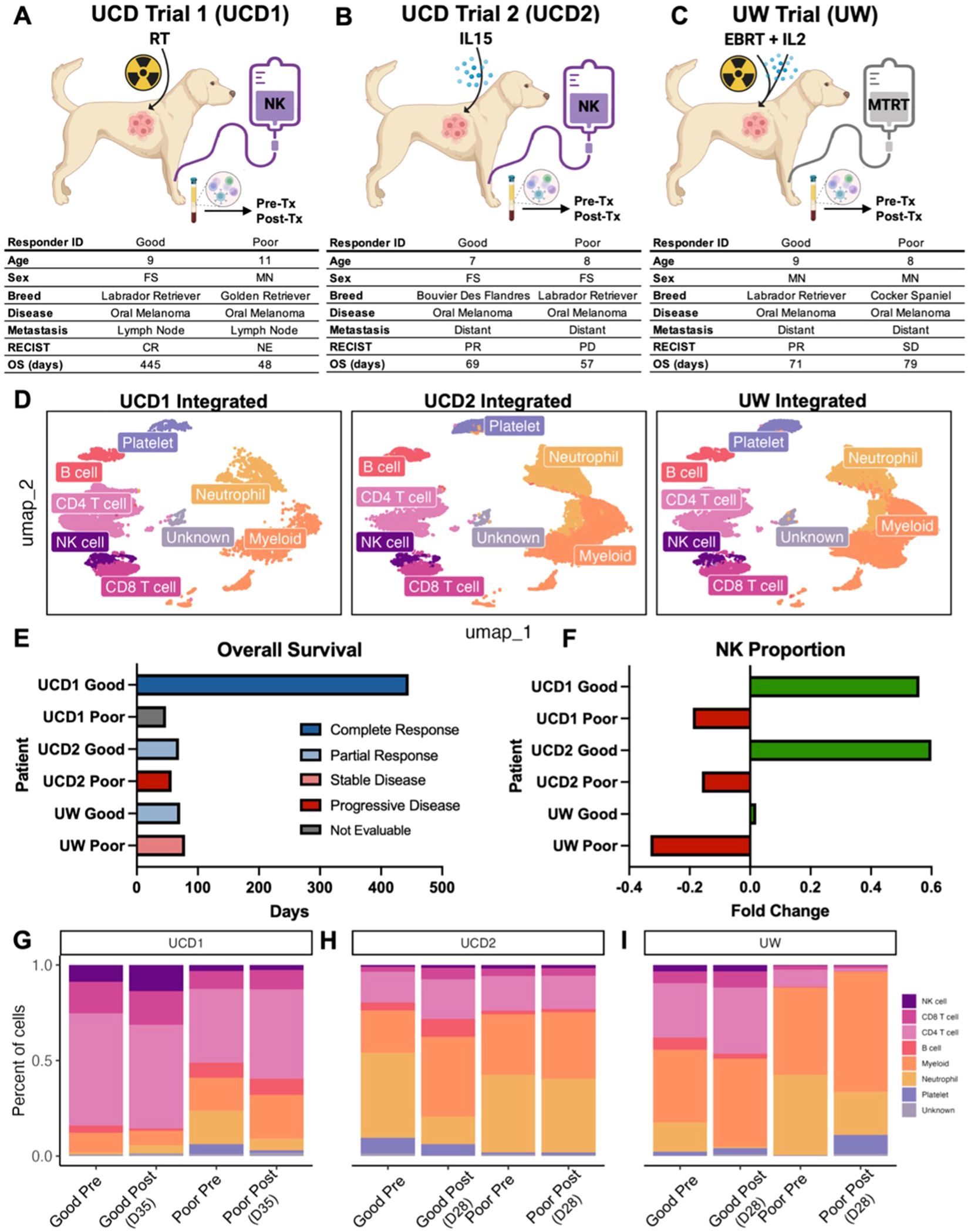 Figure 3. NK proportions increase in response to treatment in good responders to first-in-dog immunotherapy regimens. (A–C) Schema depicting clinical trial treatments and corresponding characteristics and outcomes for dogs enrolled in (A) UCD trial 1 with combination of radiotherapy and allogeneic NK cell transfer, (B) UCD trial 2 with combination of inhaled IL-15 and autologous NK cell transfer, and (C) UW trial with combination molecular targeted radionuclide therapy (MTRT), IL-2 cytokine, and external beam radiation therapy (EBRT). Good and poor responders were determined based on RECIST criteria of the primary tumor and overall survival. PBMCs were collected pre and post treatment for each dog. The UCD1 Good responder did not survive long enough to determine response and was therefore considered not evaluable (NE). *UW good responder was lost to follow up at 71 days. (D) UMAP visualizations of the twelve integrated PBMC samples split by trial and color coded by cell type. (E) Bar plot depicting the overall survival or date or last follow up (UW Good) for each of the dogs included in the analysis. Bars are color coded by response based on RECIST criteria. (F) Bar plot showing fold change of the NK cell proportion in each dog included in the analysis. Green and red bars represent positive and negative fold change respectively. Fold change of NK cell proportion was calculated by (Post-treatment – Pre-treatment)/Pre-treatment. (G–I) Bar plots showing the percent of each cell type in each PBMC sample included in the analysis. Plots are split by trial and then further split by pre and post treatment sample for each dog. Post treatment samples were obtained (G) 35 days after the start of treatment in UCD trial 1, (H) 28 days after the start of treatment in UCD Trial 2, and (I) 28 days after the start of treatment in UW trial.