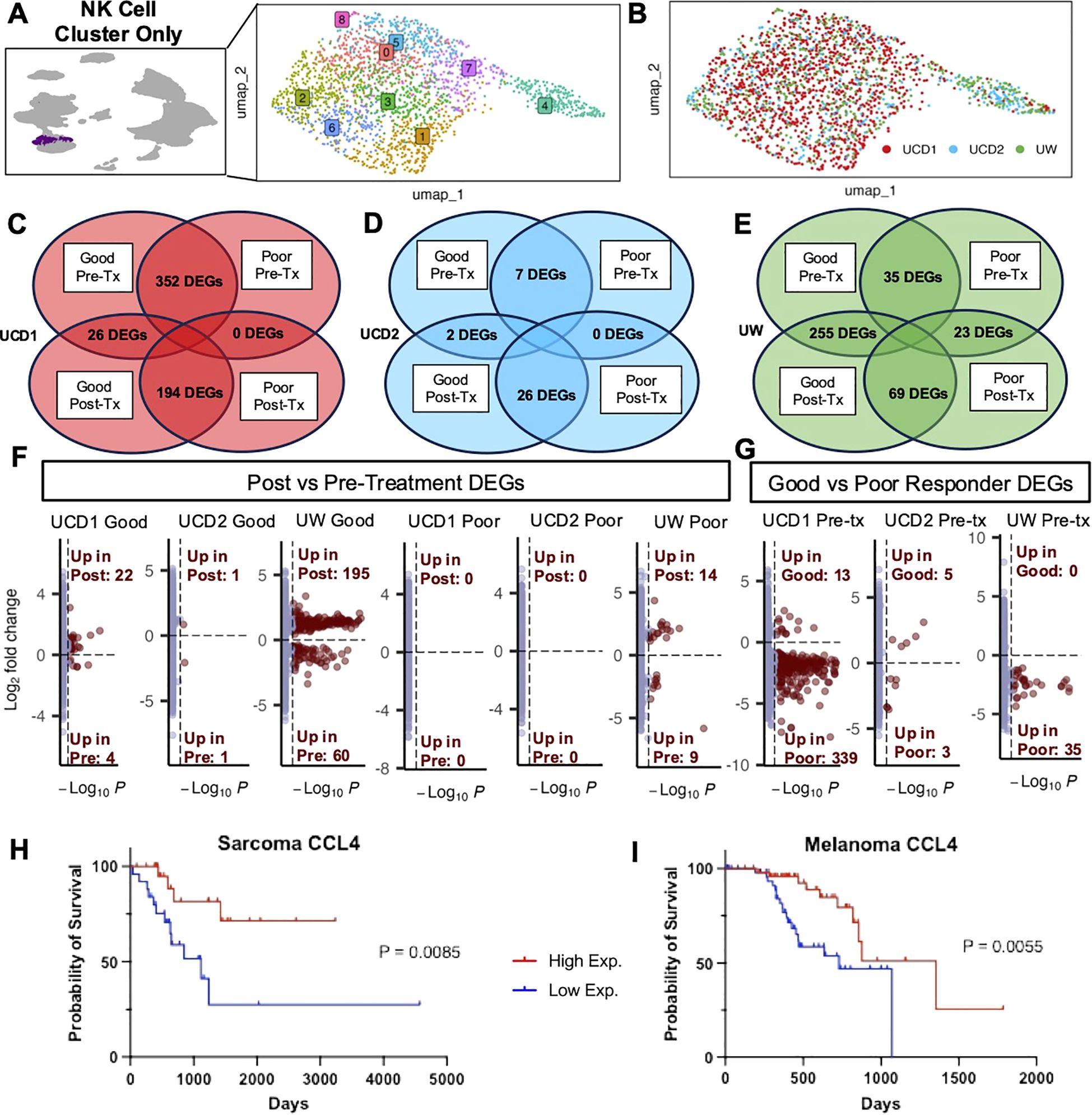 Figure 4. Good responders upregulate NK activation signatures after treatment while poor responders have minimal treatment-related changes. (A) UMAP representation of NK cells subset from the integrated PBMC samples across trials with 9 clusters identified by unsupervised clustering. (B) UMAP visualization of NK cells color coded by trial. (C–E) DEG analysis was completed between post and pretreatment for each dog and between good and poor responders for each timepoint. The number of genes with adjusted p-value<0.05 in each comparison are depicted in Venn diagrams for (C) UCD trial 1, (D) UCD trial 2, and (E) UW trial. (F, G) Volcano plots distinguish the number of genes that were significantly upregulated or downregulated in (F) post vs pre-treatment and (G) good vs poor responders pre-treatment. (H, I) Kaplan–Meier survival curve showing the survival time of TCGA UPS (H) and TCGA Melanoma (I) patient samples with high and low expression of CCL4, which was significantly upregulated both UCD1 and UW good responders in response to treatment in addition to the activated lung signature.