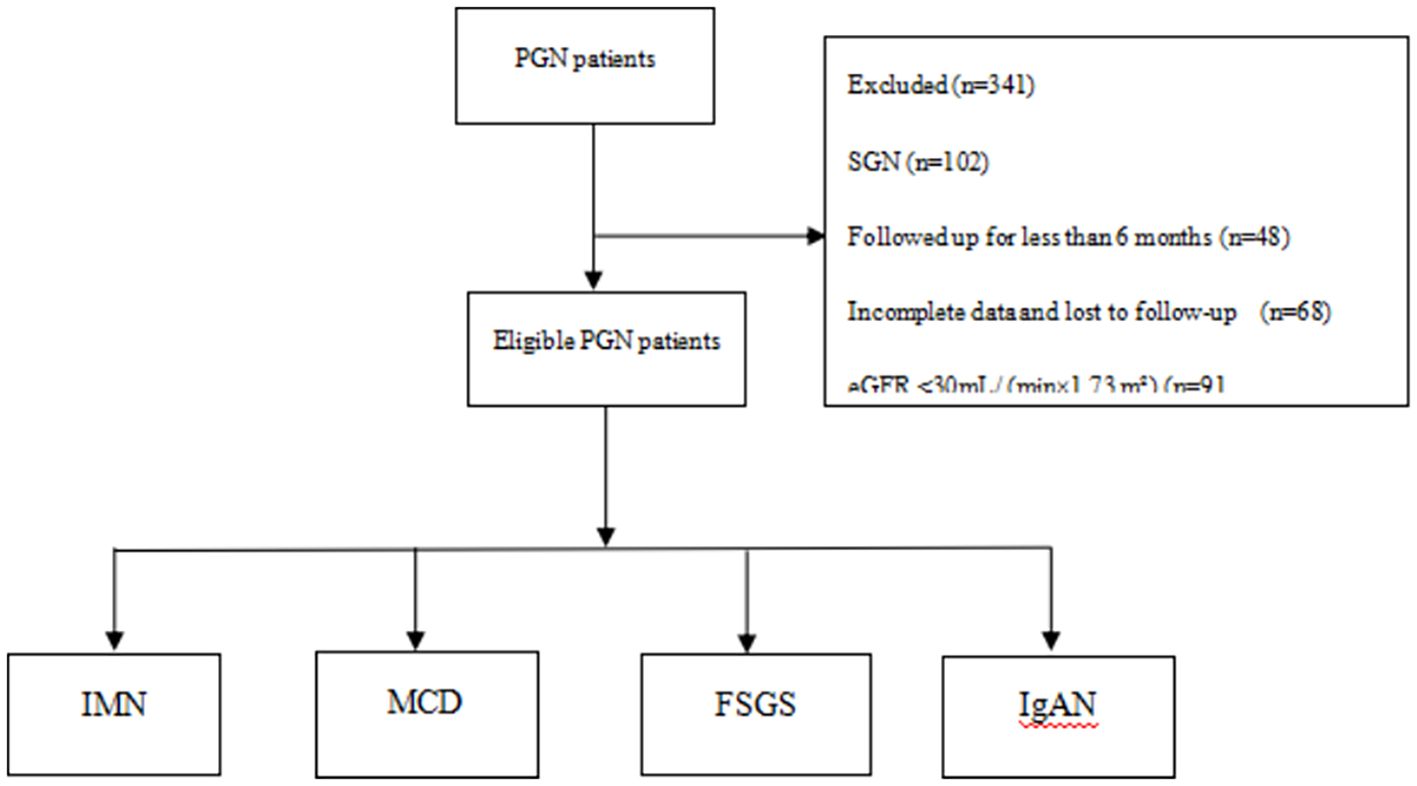 Patients with PGDs treated with RTX at the First Affiliated Hospital Nephrology Department of Nanchang University from January 1, 2021, to February 1, 2024, were included in this study. The inclusion criteria were 1) age > 14 years and 2) PGDs confirmed by renal biopsy. The exclusion criteria were as follows: 1) secondary glomerulonephritis (SGN) due to autoimmune diseases, tumors, medications, or hematological conditions; 2) estimated glomerular filtration rate (eGFR) <30 mL/(min × 1.73 m2) or patients undergoing renal replacement therapy; 3) acute infections prior to RTX treatment; 4) incomplete clinical or laboratory data or lost to follow-up; 5) clinical remission achieved before RTX; 6) the use of other biologics within 6 months prior to RTX treatment; and 7) regular follow-up of <6 months.