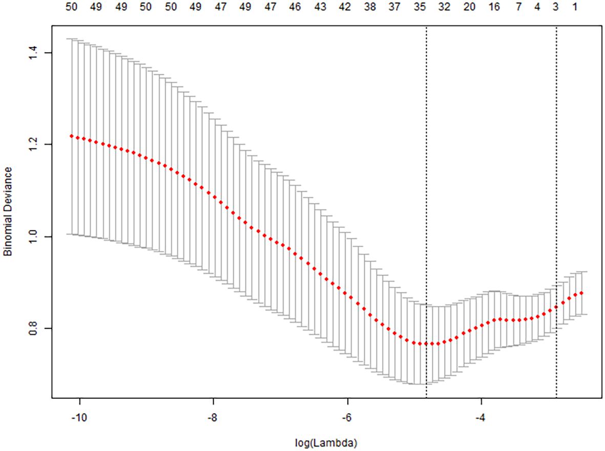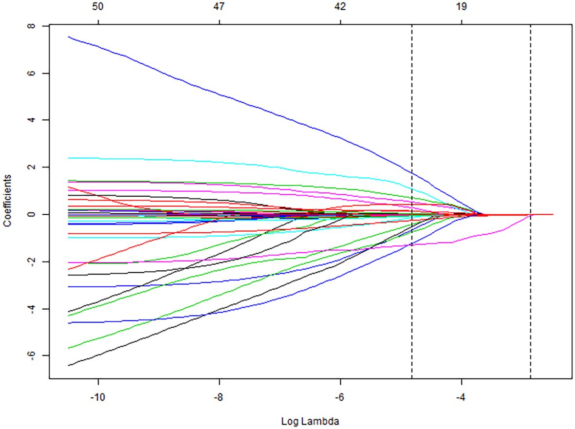 All collected clinical data were incorporated into a LASSO regression model, with the occurrence of pulmonary infection as the dependent variable. The LASSO binary logistic regression analysis identified predictors with non-zero coefficients, ultimately yielding four feature variables—sALB, age, C3, and eGFR—as detailed in Figures 2 and 3.