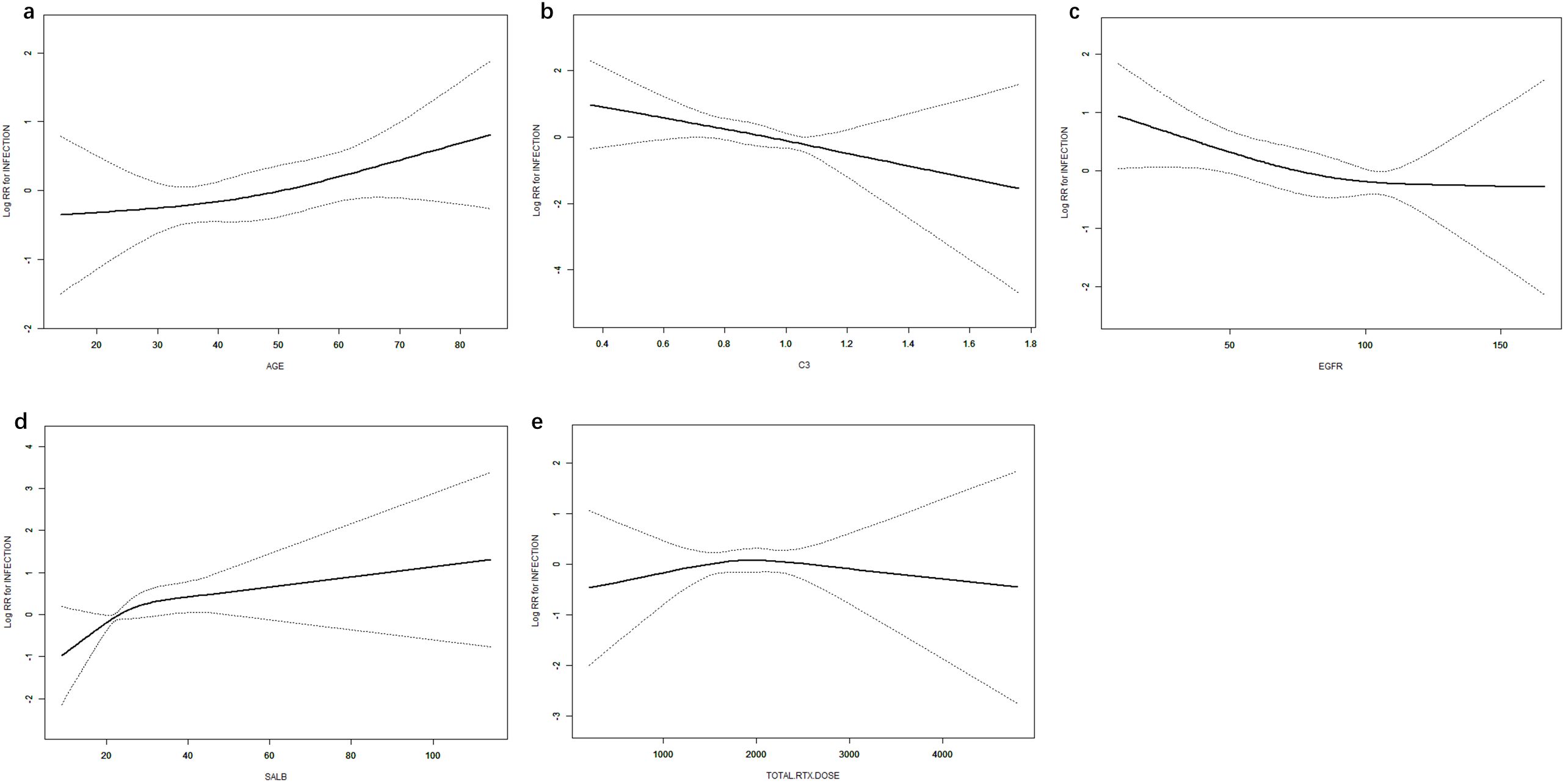 Figure 4. Dose–response relationships between age (a), C3 (b), eGFR (c), ALB (d), RTX (e), and infection. Models were adjusted for sex, age, BMI, SBP, DBP, pathological type, sALB, Scr, eGFR, WBC, HGB, PLT, NEUT, NEUT%, IgG, B-cell count, CRP, and NPAR. C3, complement component 3; eGFR, estimated glomerular filtration rate; ALB, albumin; RTX, rituximab; BMI, body mass index; SBP, systolic blood pressure; DBP, diastolic blood pressure; sALB, serum albumin; Scr, serum creatinine; HGB, hemoglobin; PLT, platelets; NEUT, neutrophils; NEUT%, percentage of neutrophils; IgG, immunoglobulin G; CRP, C-reactive protein; NPAR, neutrophil percentage-to-albumin ratio.