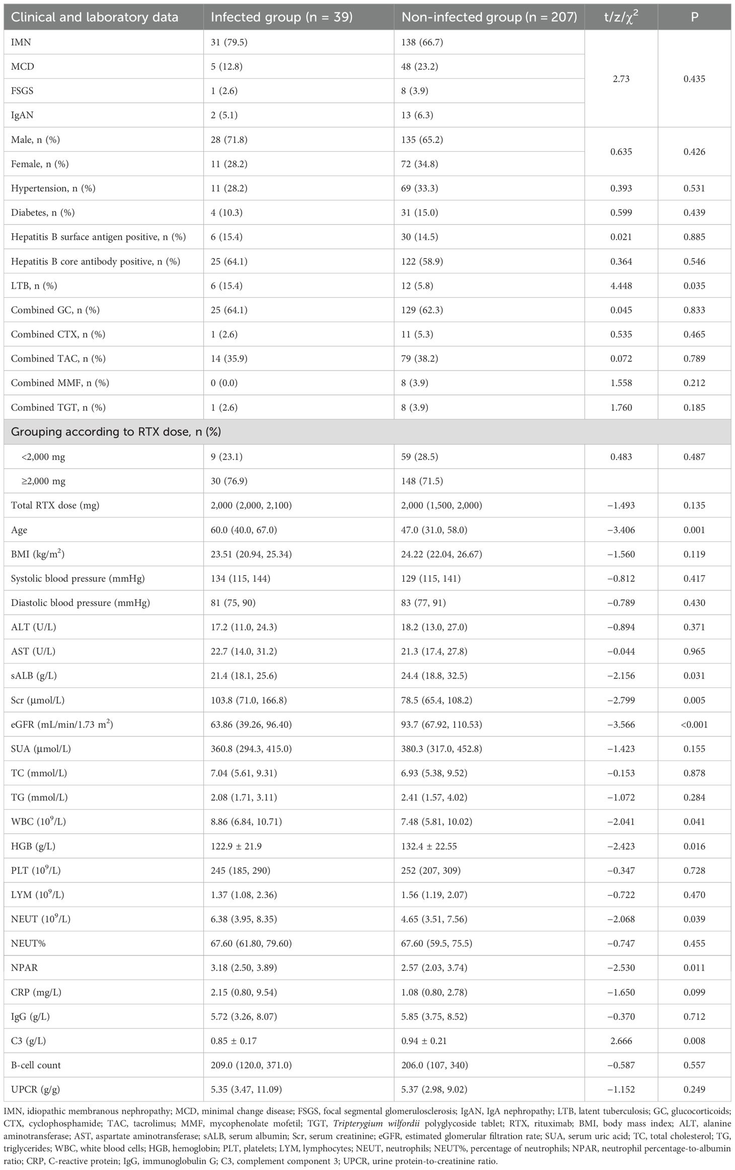 Of the 246 patients included, the median total dose of RTX was 2,000 mg, with 178 patients (72.4%) receiving a total RTX dose ≥2,000 mg and 68 patients (27.6%) receiving <2,000 mg. Of the patients, 62.6% were co-administered GC, 37.8% TAC, 4.9% CTX, 3.3% MMF, and 3.7% TGT. Within 6 months of follow-up, 39 patients (15.85%) developed pulmonary infections. Among these, infections occurred in 31 IMN patients (18.34%), five MCD patients (9.43%), one FSGS patient (11.11%), and two IgAN patients (13.33%). The median time to infection was 66.4 days (interquartile range, 37.5 to 93.5). Two patients died of respiratory failure, while the remaining patients were cured or achieved clinical improvement. Rituximab was discontinued in all cases following infection. Comparative analysis between the infected and non-infected groups revealed that the infected group had significantly higher age, Scr, WBC, NEUT, and proportion of latent tuberculosis (p < 0.05); in contrast, sALB, eGFR, C3, and HGB were lower (p < 0.05). There were no significant differences in gender, BMI, comorbidities (hypertension, diabetes, and hepatitis B), concurrent use of corticosteroids and immunosuppressants, total dose of RTX, blood pressure, ALT, AST, SUA, TC, TG, PLT, LYM, NEUT%, UPCR, CRP, IgG, and B lymphocyte counts (p > 0.05). See Table 1 for details.