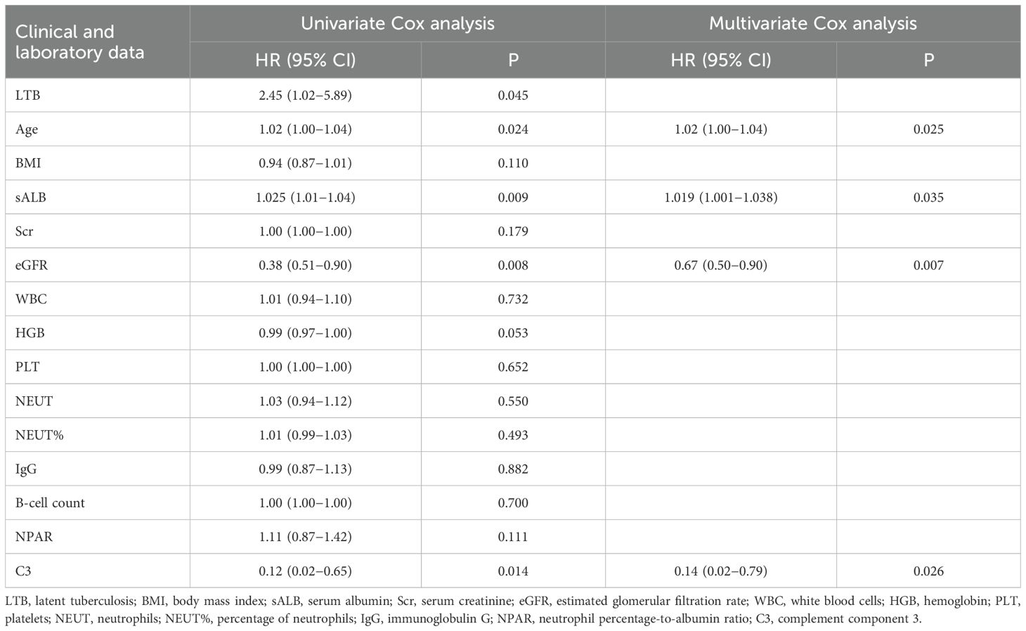 Univariate Cox proportional hazards regression analysis included clinically relevant factors and those differing significantly between groups (p < 0.1), identifying latent tuberculosis (LTB), age, C3, and eGFR as potential risk factors for infection (p < 0.05). sALB was identified as a potential protective factor (p < 0.01). Multivariate Cox proportional hazards regression analysis, incorporating clinical indicators significant in univariate analysis (p < 0.1), demonstrated that sALB is an independent protective factor against infection (p < 0.05). Age, C3, and eGFR are independent risk factors for infection (p < 0.01). Detailed results are shown in Table 2.