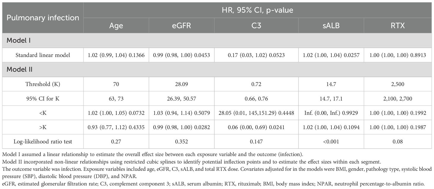 Age, eGFR, and C3 were used as continuous variables, and RCS were used to fit smooth curves. As shown in Figure 4, the risk of infection increased with higher age and sALB levels, decreased with increasing eGFR and C3 levels, and showed a non-linear pattern with RTX—rising initially and then declining. Threshold effect analysis indicated a significant threshold for ALB (p < 0.05), with the estimated inflection point (95% CI) at 14.7 g/L (14.7–17.1 g/L) based on the log-likelihood ratio test (p < 0.001). No significant threshold effects were observed for the other four variables (p > 0.05) (Table 3).