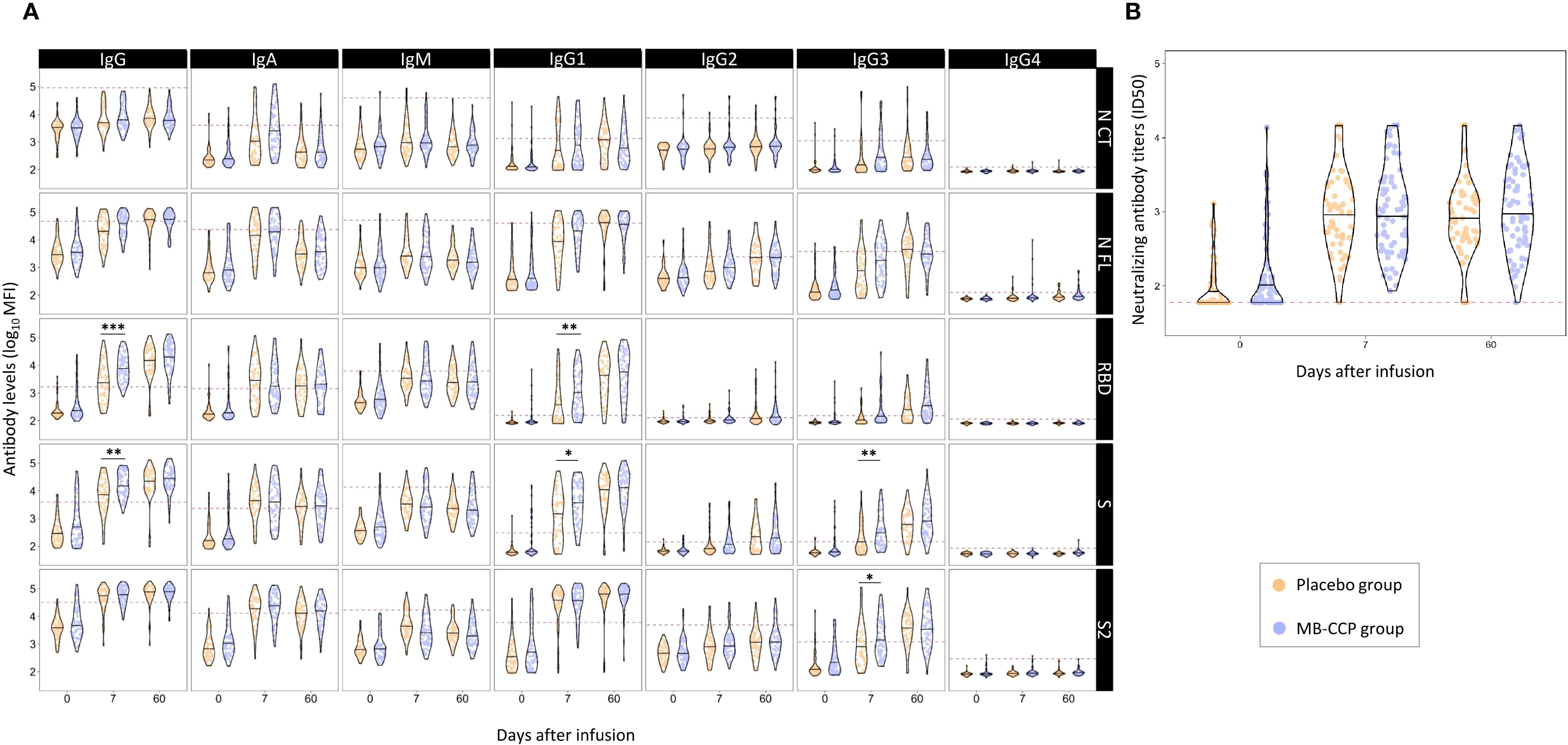 Violin plots show antibody and neutralizing antibody levels over 0, 7, and 60 days after infusion for placebo (orange) and MB-CCP (blue) groups. Panel A displays IgG, IgA, IgM, IgG1, IgG2, IgG3, IgG4 levels against different antigens. Significant differences are marked with asterisks. Panel B shows neutralizing antibody titers.