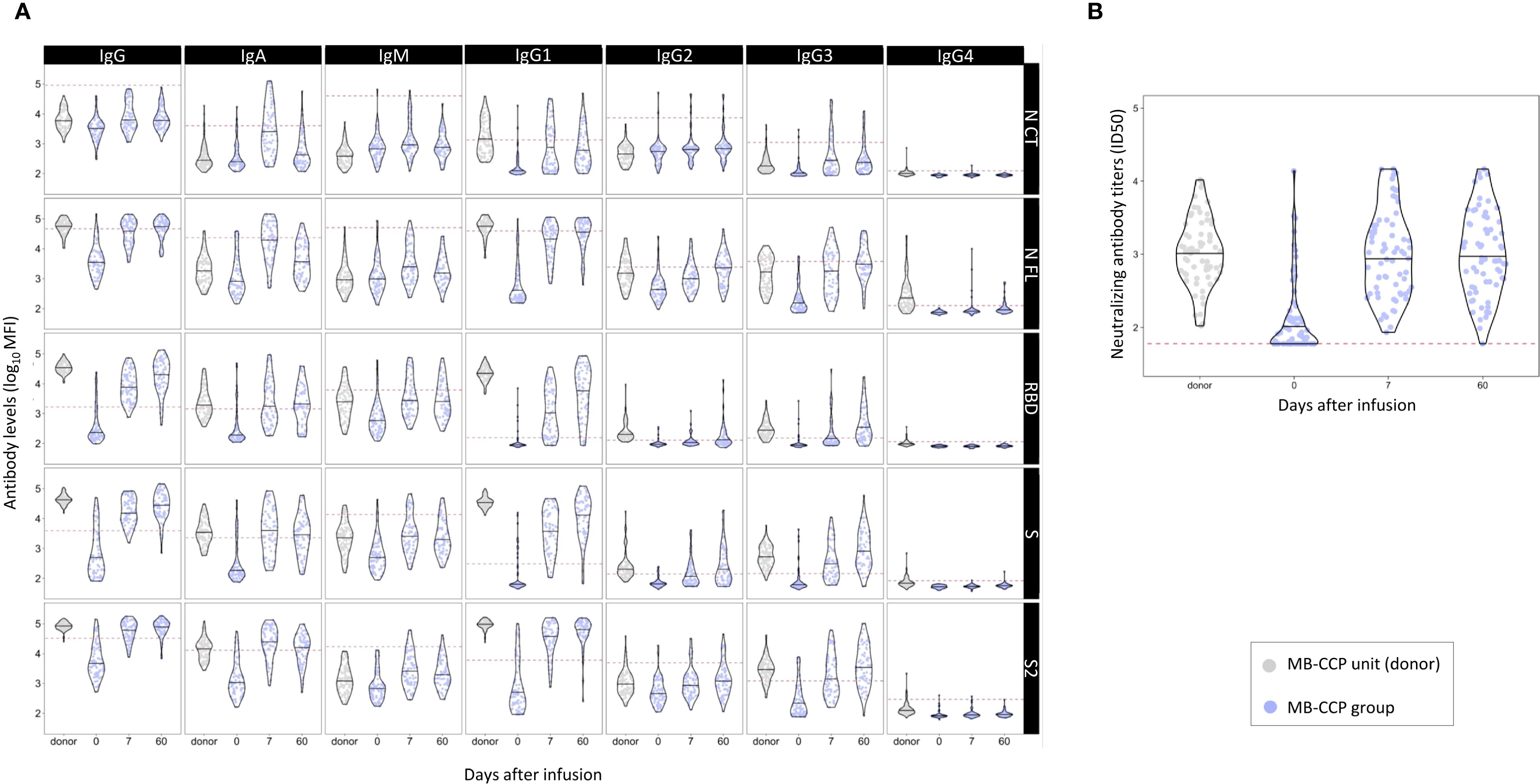 Figure 2. Distribution of anti-SARS-CoV-2 antibody levels in methylene blue-treated COVID-19 convalescent plasma (MB-CCP) units and in participants who received MB-CCP infusion (MB-CCP group) at baseline, day 7, and day 60 after infusion. Legend: Violin plots of antibody levels in log10 in methylene blue-treated COVID-19 convalescent plasma (MB-CCP) units and in study participants who received MB-CCP infusion at baseline, day 7, and day 60 after infusion (n = 68), with median (hick solid line). (A) Distribution of antibody isotypes (IgG, IgM, and IgA) and subclasses (IgG1, IgG2, IgG3, and IgG4) against five different viral target antigens [nucleocapsid C-terminal region (NCT), nucleocapsid full protein (NFL), receptor-binding domain (RBD), spike full protein (S), and S2 fragment (S2)] in median fluorescent intensity (log10 MFI) measured using Luminex. Red dotted lines correspond to the seropositivity cutoffs defined as 10 to the mean plus 3 standard deviations (SD) of log10-transformed MFI values of 92 and 128 (IgA/IgM and IgG, respectively) prepandemic controls. (B) Distribution of neutralizing antibody titers (ID50) assessed by pseudovirus neutralization assay against Wuhan/WH1. MB-CPP, methylene blue-treated COVID-19 convalescent plasma; ID50, 50% inhibitory dilution; MFI, mean fluorescence intensity.