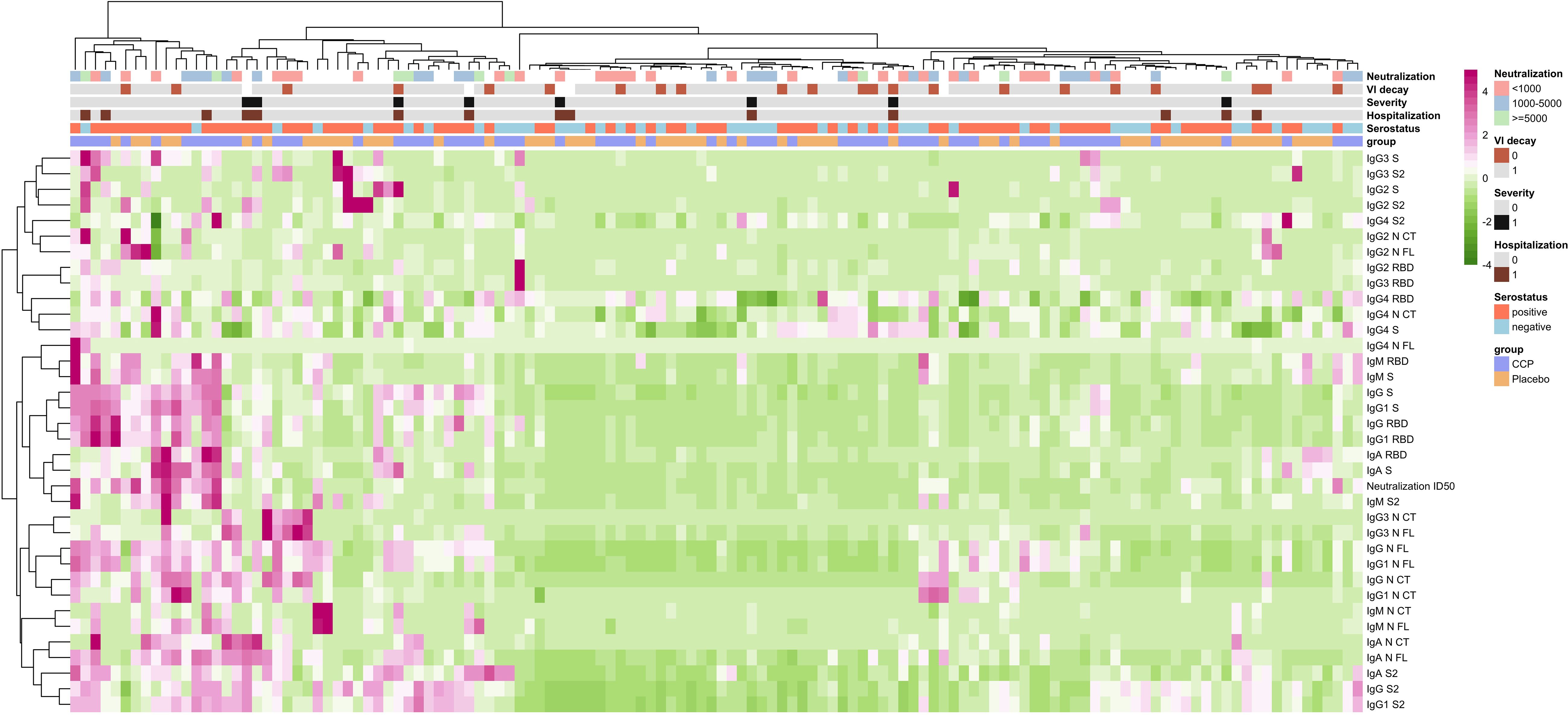 Figure 3. Heatmap of correlations between immune responses with receipt of MB-CCP and with clinical and virological outcomes. Legend: Heatmap with hierarchical clustering in patients and in antibodies, exploring multivariable relationship between immune responses, and clinical and virological outcomes. Immune responses were measured as increase from baseline to day 7 in all antibody levels, including isotypes IgG, IgM, and IgA and subclasses IgG1, IgG2, IgG3, and IgG4 measured using Luminex (in MFI), and neutralizing antibodies assessed by pseudovirus neutralization assay against Wuhan/WH1 (in ID50). Clinical outcomes included hospitalization within 28 days (0 = non-hospitalized; 1 = hospitalized) and severe COVID-19, defined as hospitalization with requirement of oxygen by non-invasive ventilation or high flow, intubation and mechanical ventilation, or death (WHO Clinical Progression Scale score 6 to 10) (0 = non-severe COVID-19; 1 = severe COVID-19). Virological outcome was defined as VL decay between baseline and day 7 (0 < 1 log10, 1 ≥ 1 log10). We also explored relationship with 1) neutralizing antibody titers contained in MB-CCP infusion (neutralization; stratified as neutralizing antibody titers ID50 <1,000, 1,000 to 5,000, and ≥5,000); 2) serostatus of participants at baseline based on results by Luminex (i.e., seronegative = IgG negative + IgG subclasses (IgG1, IgG2, IgG3, and IgG4) negative + IgM negative + IgA negative vs. seropositive = any positive response for any of the isotypes/antigen pairs); and 3) treatment group of participants (CCP = MB-CCP group; placebo = placebo group). Clusters were built using the Ward minimum variance clustering method with Murtagh and Legendre criterion, implemented in the hclust R function under the “ward.D2” option. MB-CCP, methylene blue-treated COVID-19 convalescent plasma.