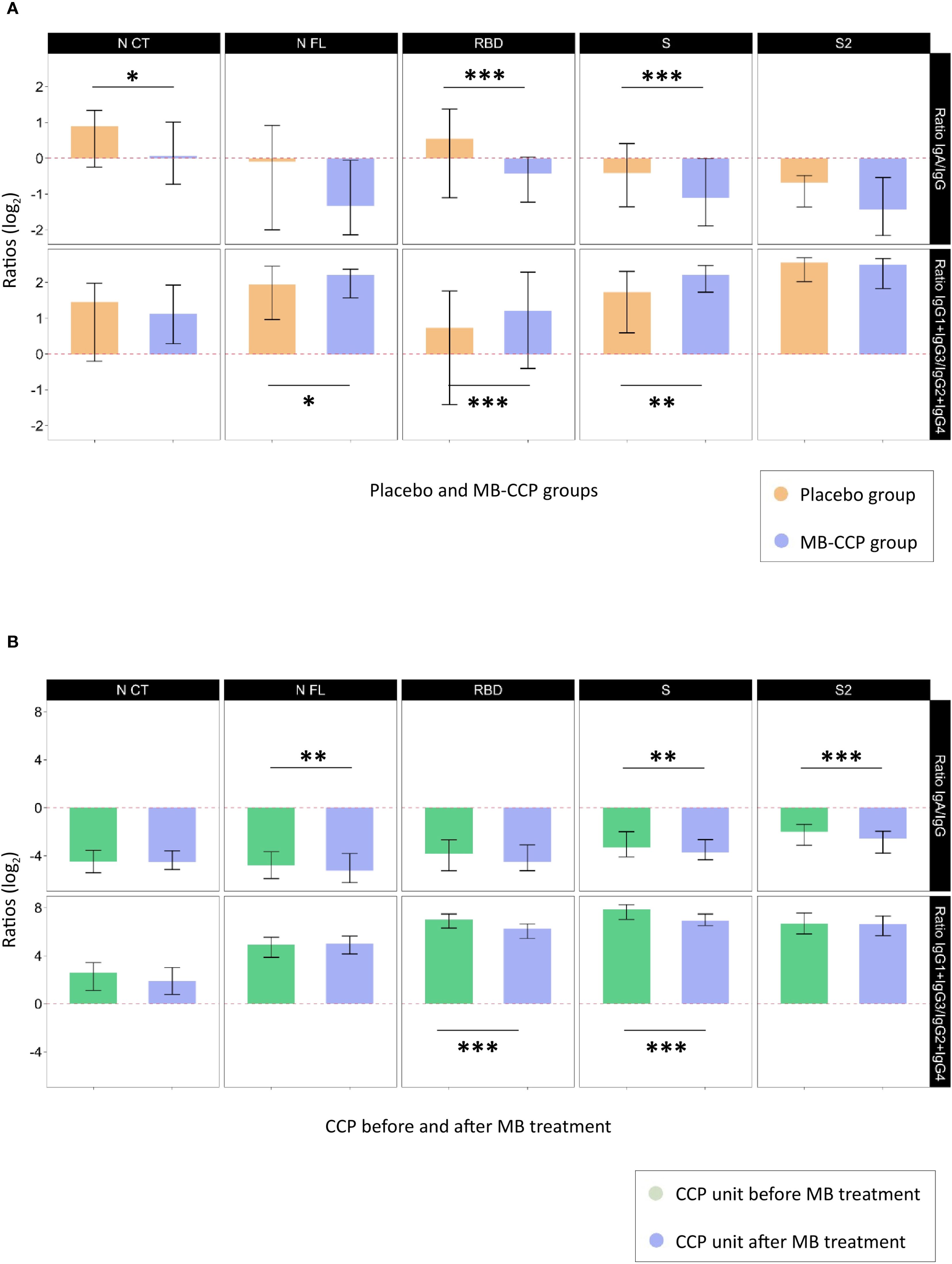 Figure 5. Ratios of IgA/IgG isotypes and cytophilic over non-cytophilic IgG subclasses. Legend: Ratios of IgA/IgG isotypes and cytophilic over non-cytophilic IgG subclasses (IgG1 + IgG3/IgG2 + IgG4) for each of the antigens (NCT, NFL, RBD, S, and S2) that could reflect differential non-neutralizing Fc-related functional characteristics, expressed in log2. (A) Study participants at day 7 after infusion according to treatment group [placebo (n = 60) and MB-CCP groups (n = 68)]. (B) COVID-19 convalescent plasma units before and after treatment with methylene blue (n = 40). Asterisks indicate statistically significant (*p < 0.05, **p < 0.01, and ***p < 0.001) differences in ratios calculated with antibody levels above the seropositivity cutoffs. The full statistical description is shown in Supplementary Table S5. NCT, nucleocapsid C-terminal region; NFL, nucleocapsid full protein; RBD, receptor-binding domain; S, spike full protein; S2, S2 fragment; MB-CCP, methylene blue-treated COVID-19 convalescent plasma.