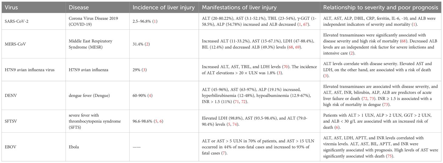 Liver injury caused by emerging infectious diseases is usually characterized by elevated transaminase and bilirubin levels and decreased ALB levels, but the specific manifestations vary according to the pathogen. Liver damage is often associated with rapid disease progression and poor prognosis. More severe disease, slower rate of recovery, and worse prognosis are usually observed in patients with concurrent disease in the liver. In terms of liver pathology, hepatocyte necrosis, inflammatory infiltration, and steatosis were prevalent, and ultrastructure showed destruction such as mitochondrial swelling and endoplasmic reticulum deformation.