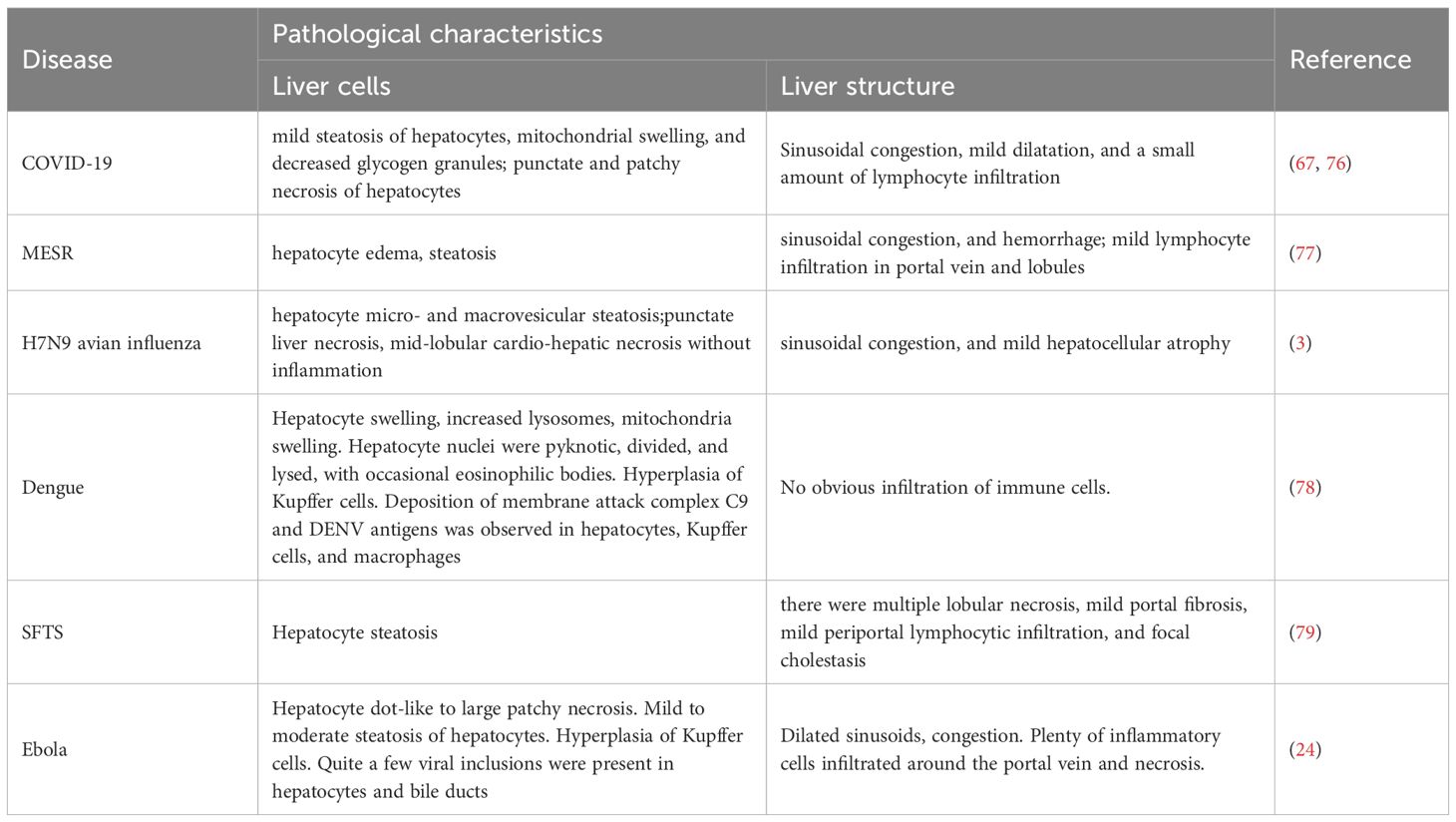 Although liver injury is a common feature after SARS-CoV-2, MERS-CoV, H7N9 avian influenza, DENV, SFTSV, and EBOV infection, the characteristics of liver injury caused by different viral infections vary. The clinical and pathological characteristics of liver injury caused by the above six emerging infectious diseases are summarized in Tables 1 and 2.