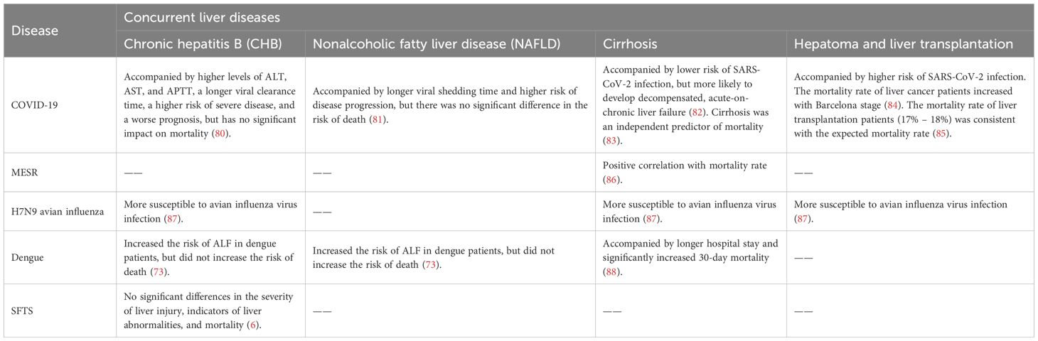 In addition to abnormal liver function, the interaction between concurrent liver diseases and the above infectious diseases has also aroused high concern (Table 3). SARS-CoV-2 has been well studied in combination with prior liver disease. Relatively speaking, studies on co-infection of other liver diseases with MERS-CoV, H7N9, and SFTS are limited. There are no systematic studies between Ebola and hepatic complications.
