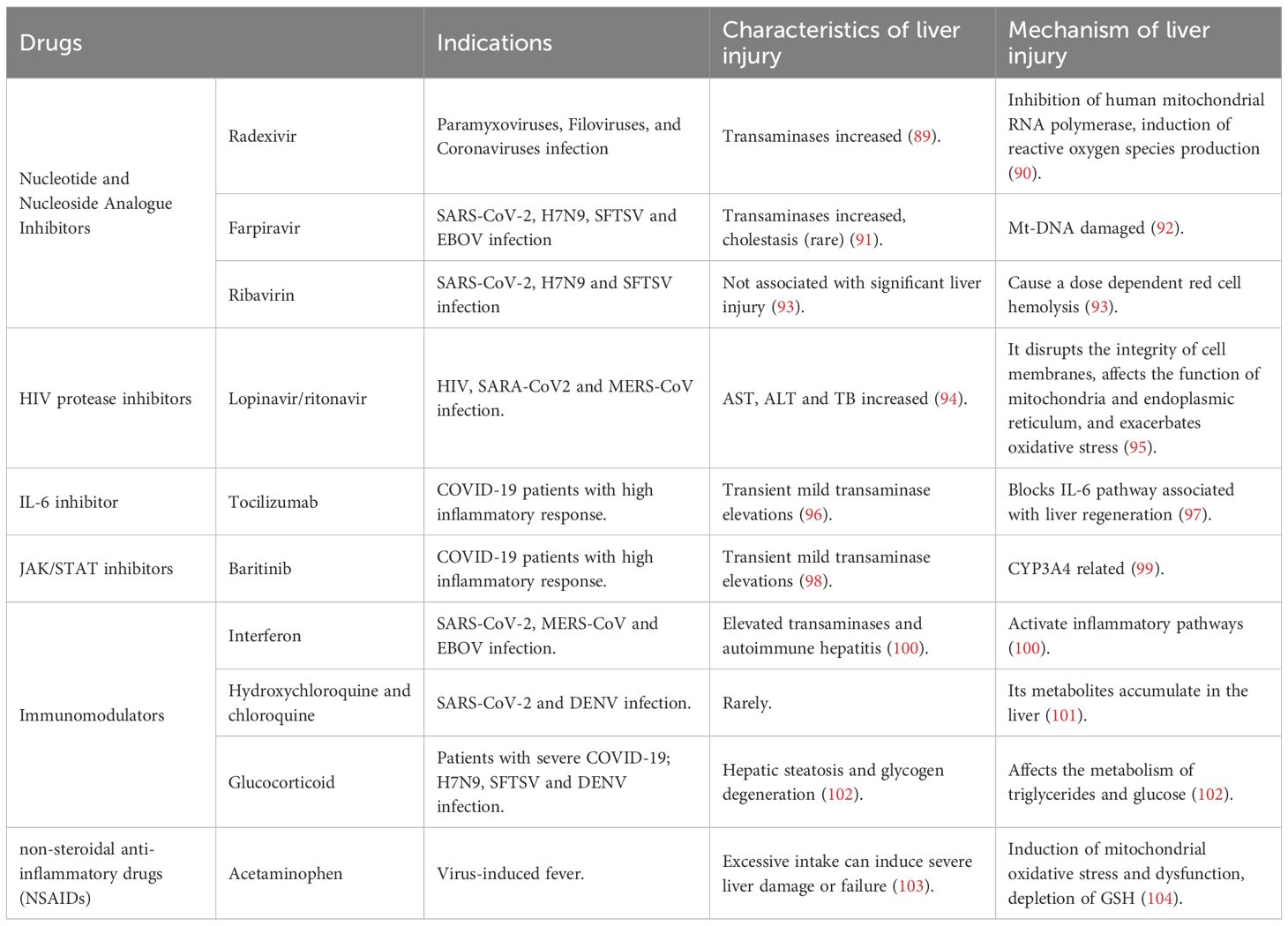 Antibiotics, antivirals, antipyretic and analgesic drugs, and steroids are widely used to treat emerging infectious diseases, all potential factors for liver injury. To date, antiviral drugs widely used to treat the above contagious diseases include ribavirin, favipiravir, lopinavir/ritonavir, chloroquine, interferon, and monoclonal antibodies, and their characteristics and mechanisms of causing liver injury are shown in Table 4.