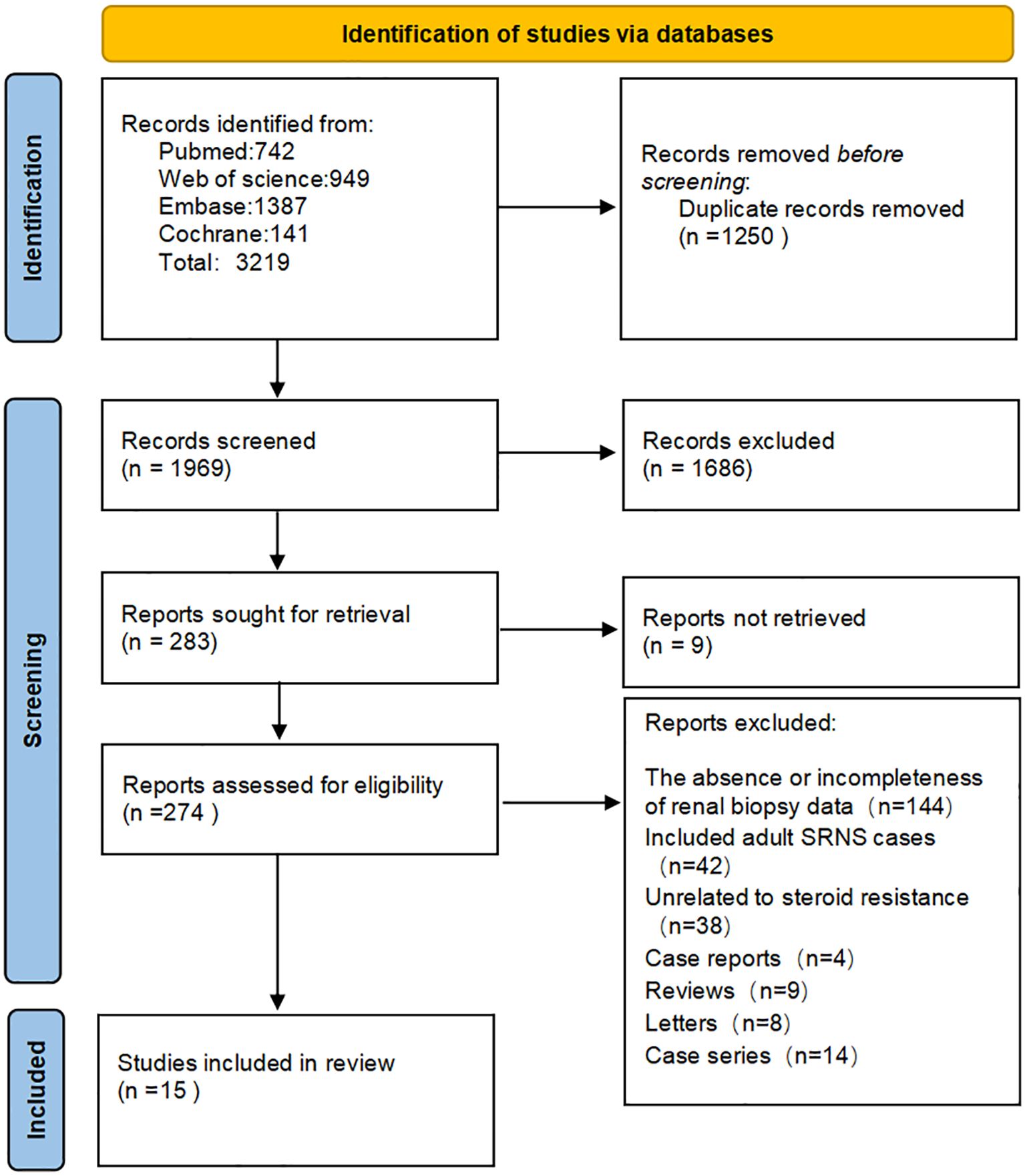 The articles included in this review comprised prospective studies, retrospective studies, and randomized controlled trials, focusing on children and adolescents aged 3 months to 18 years. A total of 3,219 articles were initially retrieved, with 1,250 duplicates removed. After reviewing the titles and abstracts of the remaining 1,969 articles, 283 were selected for full-text review. Of these 283 articles, 9 did not have the original text available, and 274 articles were successfully retrieved in full. Upon full-text review, 247 articles were excluded, including those the absence or incompleteness of renal biopsy data(144 articles), case reports (4 articles), reviews (9 articles), studies involving adult SRNS (42 articles), studies unrelated to steroid resistance (38 articles), letters (8 articles), case series (14 articles). Ultimately, 15 studies were included. Figure 1 shows the PRISMA flowchart of the selection process.