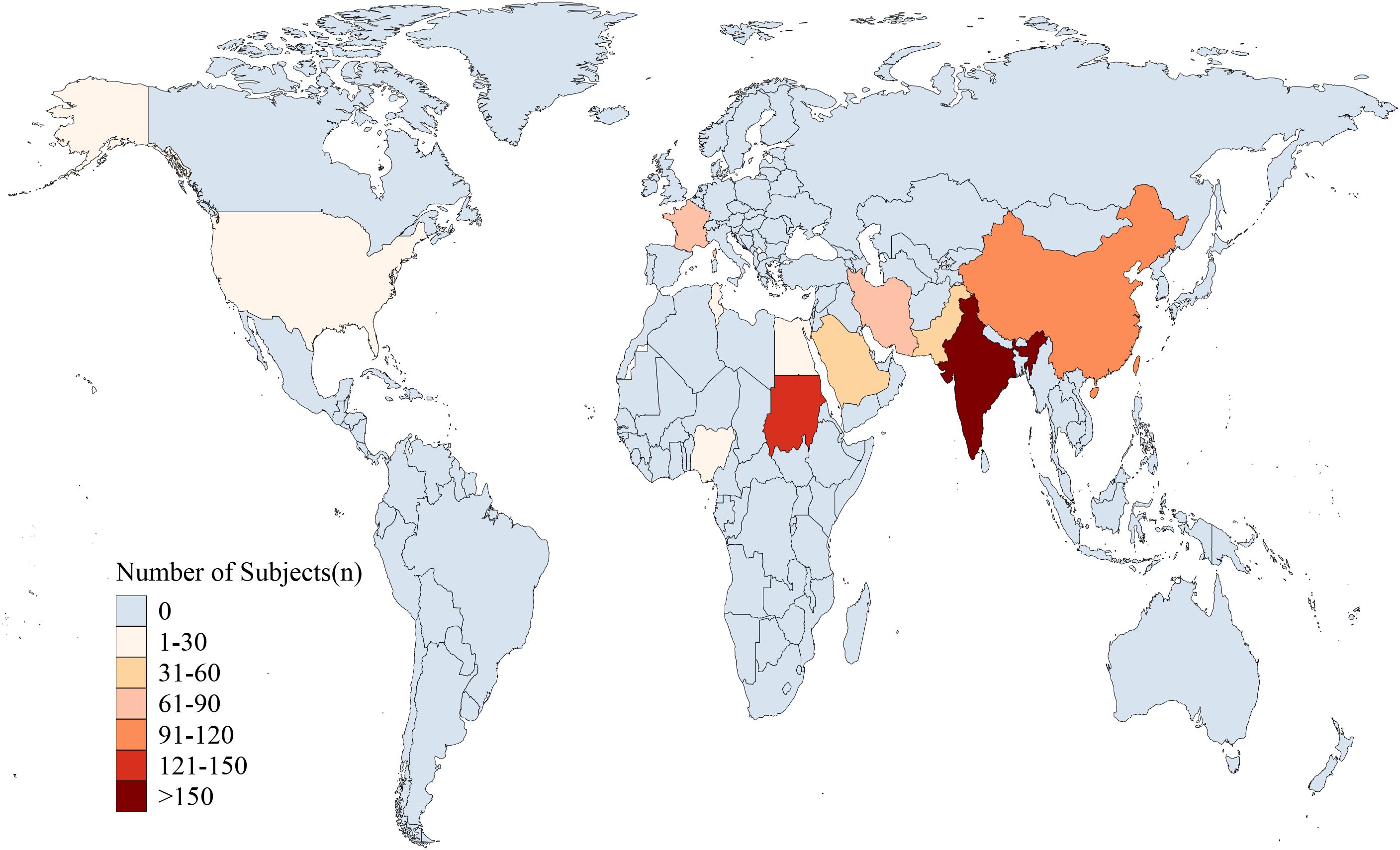 Figure 2. Geographical distribution of study participants. (The participant distribution across the included countries was: Iran (66), India (250), China (100), Kingdom of Saudi Arabia (37), Pakistan (46), Tunisia (30), Nigeria (23), Sudan (130), United States (29), France (78), and Egypt (16).