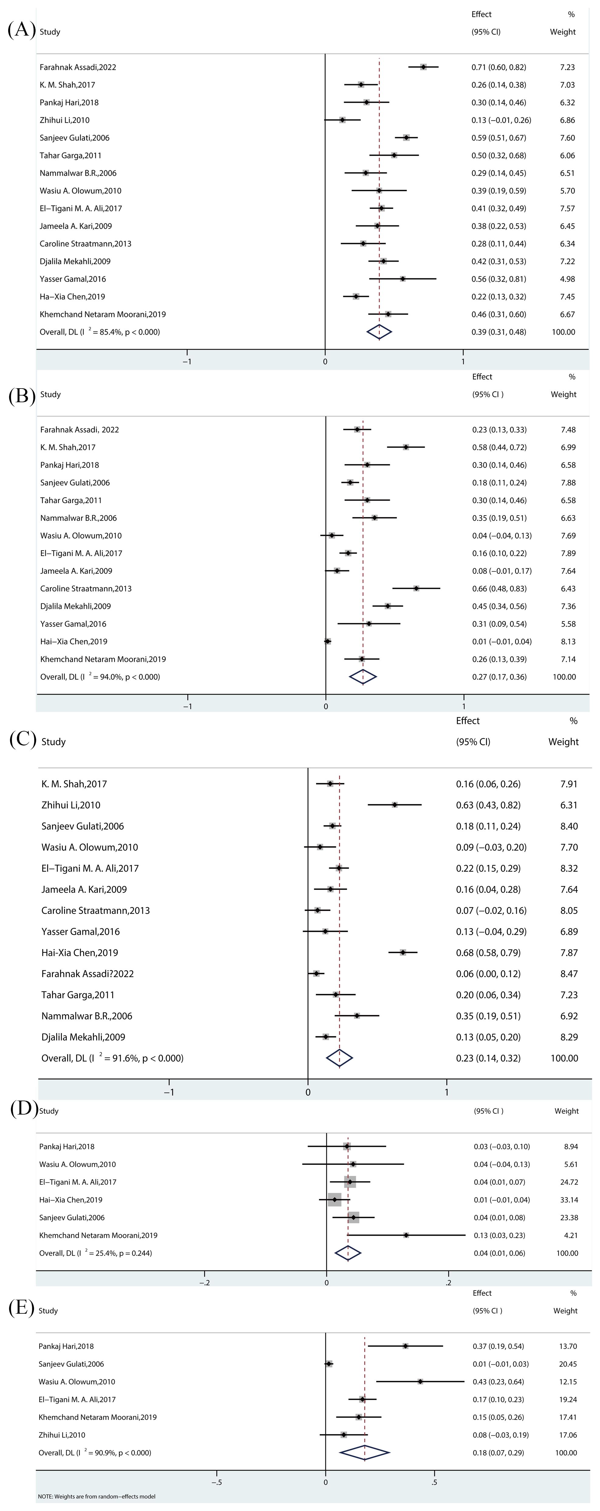The estimated prevalence of histopathological subtypes associated with SRNS is as follows: FSGS: 39% (95% CI, 31-48; I² = 85.4%; p < 0.000) (Figure 3A); MN: 4% (95% CI, 1-6; I² = 25.4%; p = 0.244) (Figure 3D); MCD: 27% (95% CI, 17-36; I² = 94.0%; p < 0.000) (Figure 3B); MesPGN: 23% (95% CI, 14-32; I² = 91.6%; p < 0.000) (Figure 3C); MPGN: 18% (95% CI, 7-29; I² = 90.9%; p < 0.000) (Figure 3E). The I² statistic reveals high heterogeneity for most SRNS histopathological subtypes, except for MN, which exhibited low heterogeneity (I² < 50%).