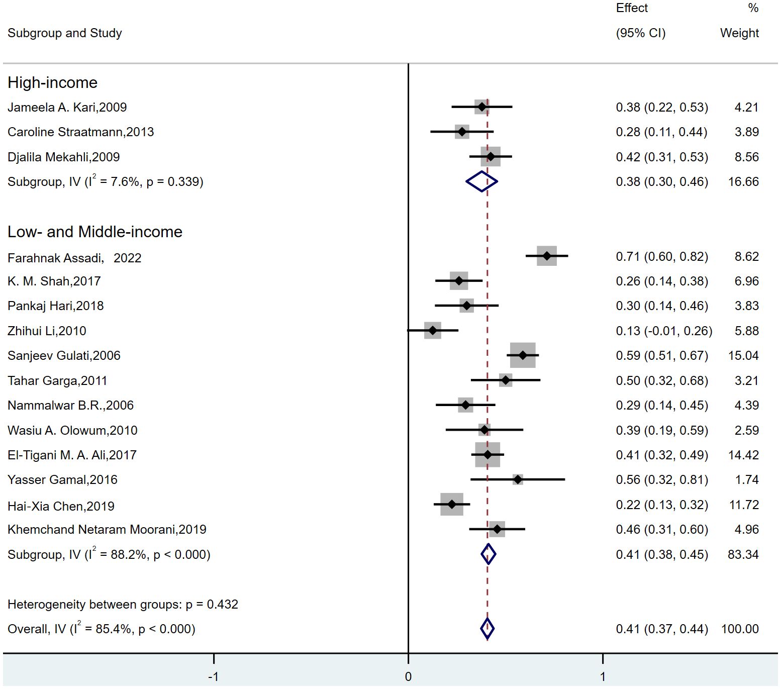 For FSGS, MCD, and MesPGN, subgroup analyses were conducted based on the income level of the country where the study was conducted (high-income, low-income, and middle-income countries). Since MN exhibited low heterogeneity, no subgroup analysis was conducted for this subtype. Additionally, no studies from high-income countries were available for MPGN, so subgroup analysis was not performed for these two histopathological subtypes. The results showed that when grouping by the income level of the country where the study was conducted, the following observations were made:for FSGS(Figure 4), the “low- and middle-income” group (7–12, 14–19) exhibited high heterogeneity (I² = 88.2%, p < 0.000), while the “high-income” group (13, 20, 21) showed low heterogeneity (I² = 7.6%, p = 0.339). Therefore, the heterogeneity in FSGS could be attributed to the “low- and middle-income” populations. For MesPGN (Supplementary Figure 10), the “low- and middle-income” group (7, 8, 10–12, 14, 16–19) showed high heterogeneity (I² = 93.2%, p < 0.000), while the “high-income” group showed very low heterogeneity (I² = 0.0%, p = 0.431). This suggests that the heterogeneity in MesPGN might also stem from the “low- and middle-income” populations. For MCD(Supplementary Figure 11), heterogeneity remained high both before and after subgrouping based on “country income level”.