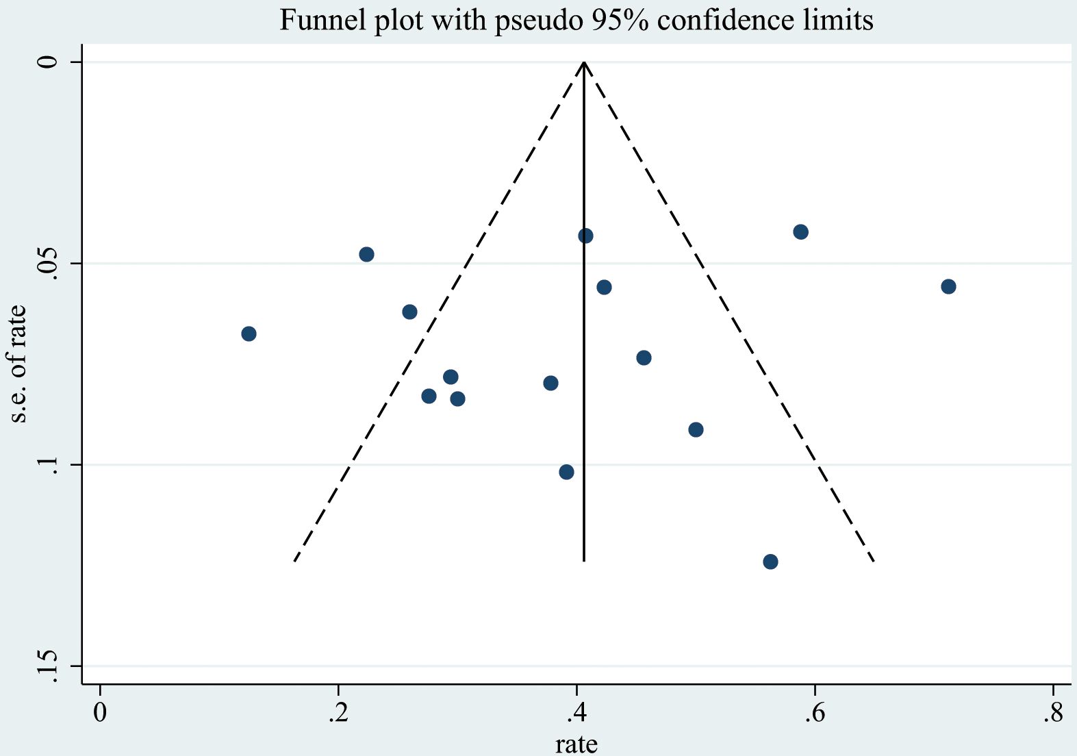 A total of 13 studies reported the prevalence of MesPGN. Of these, 2 experimental studies (7, 8) (RCTs) reported prevalence rates between 6.1% and 16%, while 11 observational studies (10–14, 16–21) (prospective, retrospective, and cross-sectional) reported rates ranging from 8.7% to 68.42%. The pooled effect size was statistically significant [Rate = 23%, 95% CI (14–32), p = 0.00].