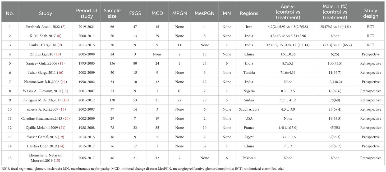 Table 1 summarizes the characteristics of the studies included in this review. The studies were conducted in 11 different countries or regions, distributed across Asia [9 studies (7–15)], Africa [4 studies (16–19)] and Europe/North America [2 studies (20, 21)]. The participant distribution across the included countries was: Iran (66), India (250), China (100), Kingdom of Saudi Arabia (37), Pakistan (46), Tunisia (30), Nigeria (23), Sudan (130), United States (29), France (78), and Egypt (16)(Table 1, Figure 2). The majority of studies were observational (n = 12), while the remaining three studies (7–9) were randomized controlled trials (RCTs). All studies focused on children aged 3 months to 18 years diagnosed with SRNS. Each study reported the prevalence of various histopathological subtypes of SRNS, with five subtypes included in the analysis: FSGS, membranous nephropathy (MN), minimal change disease (MCD), mesangioproliferative glomerulonephritis (MesPGN), and membranoproliferative glomerulonephritis (MPGN). The most commonly reported subtypes were FSGS (n = 15), MCD (n = 14), and MesPGN (n = 14). Eleven studies (7–10, 14–20) were published after 2010. All studies reported prevalence data for both boys and girls. The quality score for each included study was at least 6 points, with the detailed quality assessment provided in the Supplementary Table 1. When patient ages followed a normal distribution, they were presented as mean ± standard deviation; otherwise, the median and interquartile range were reported.