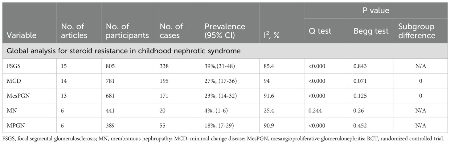 Steroids are the most commonly used treatment for nephrotic syndrome in clinical practice. However, different histopathological subtypes often predict varying outcomes and responses to steroid therapy. Some patients with idiopathic nephrotic syndrome may undergo a series of potentially harmful treatments without clinical benefit (1). Previous study have indicated a high prevalence of focal segmental glomerulosclerosis(FSGS) in children with nephrotic syndrome in sub-Saharan Africa (4), making it the most common histopathological subtype of SRNS worldwide. However, due to the limited number of studies included in that review, a meta-analysis has not yet been performed. To the best of our knowledge, no meta-analysis has been published on the prevalence of pathological subtypes in children with SRNS. In this study, we conducted a systematic literature search to extract data on the prevalence of histopathological subtypes and performed a meta-analysis to determine the prevalence of each subtype. Our findings will provide valuable insights for guiding clinical treatment decisions and predicting outcomes in children with SRNS.