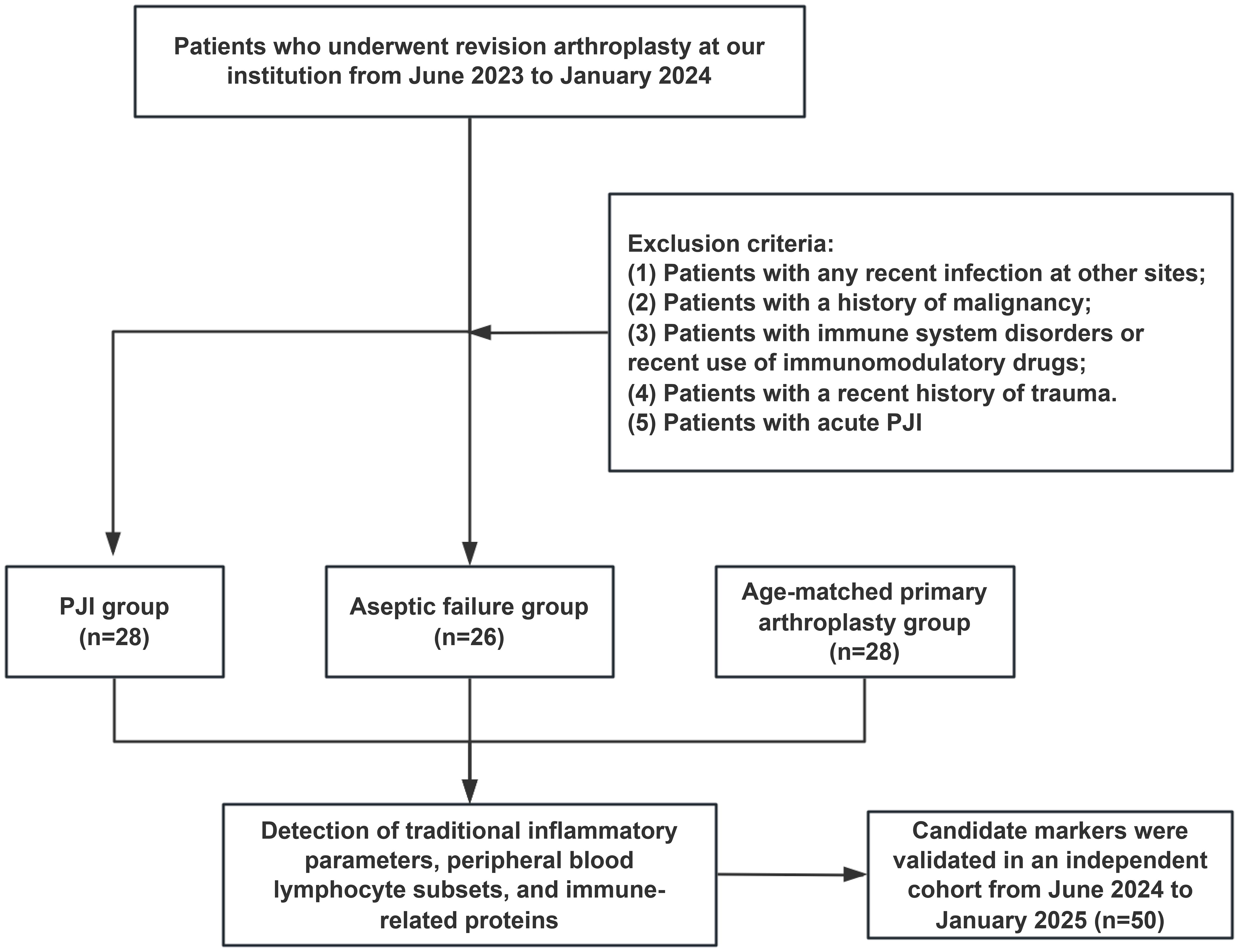 This prospective study, approved by the Institutional Ethics Committee, included the patients scheduled for hip or knee revision arthroplasty from June 2023 to January 2024 at our department. Inclusion criteria were: (1) adults aged between 18 and 80 years; (2) those scheduled for hip or knee revision surgery; (3) those with complete preoperative medical records and available peripheral blood samples; (4) those who provided informed consent. Exclusion criteria were: (1) patients with infections at other sites within two weeks, such as respiratory or urinary tract infections; (2) those with a history of malignant tumors; (3) those with autoimmune diseases such as systemic lupus erythematosus, psoriasis, or ankylosing spondylitis, or recent use of immunomodulatory drugs; (4) those with recent extensive skin ulceration, severe hematoma, or traumatic fracture; (5)those with acute PJI occurring within three months of TJA. PJI was diagnosed using the Musculoskeletal Infection Society (MSIS) criteria (17).