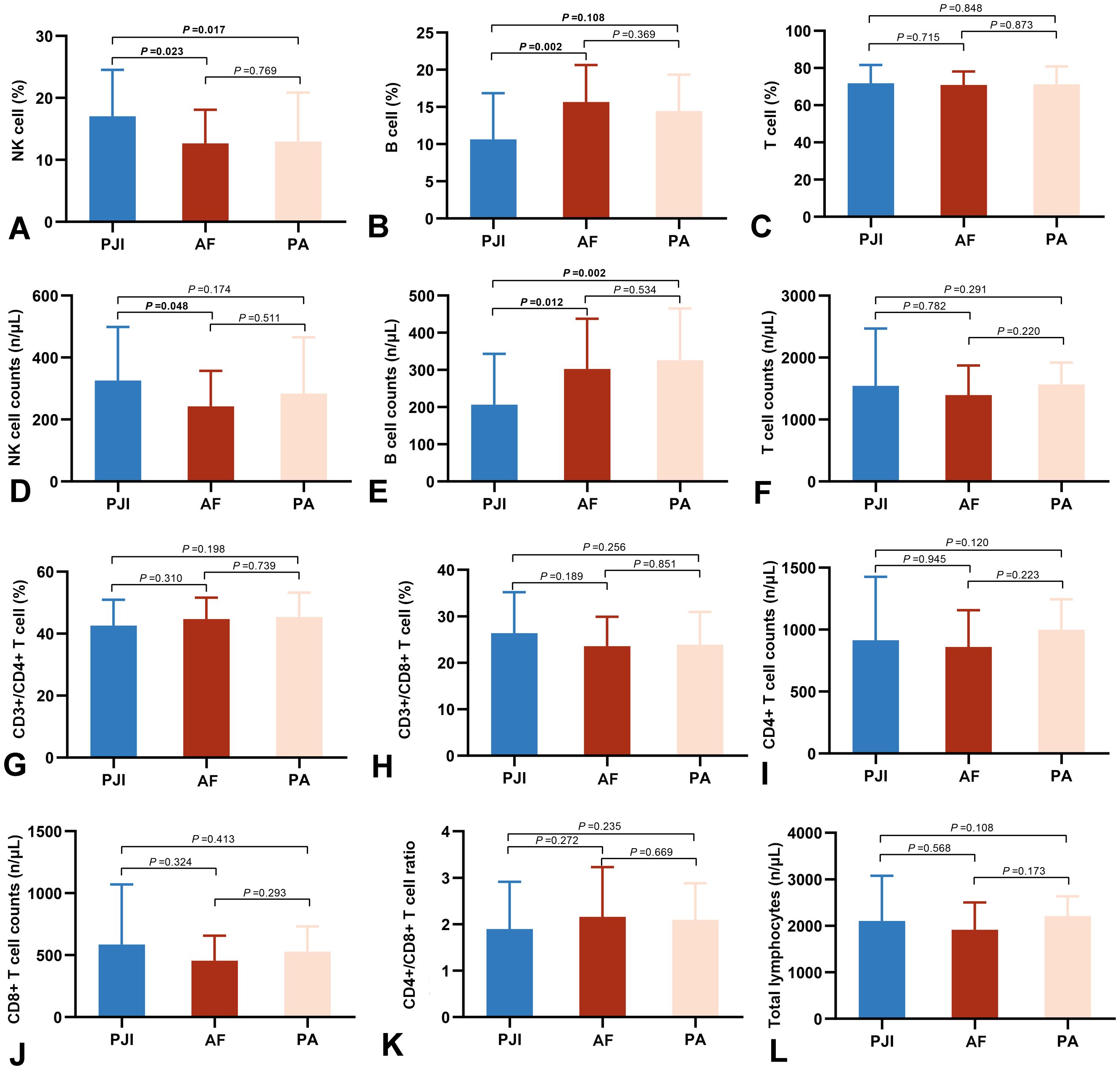 Figure 2. Comparison of peripheral lymphocyte subsets in the three groups, including percentages and absolute counts of NK cells (A, D), B cells (B, E), T cells (C, F), CD3+/CD4+ T cells (G), CD3+/CD8+Tcells (H), CD4+ T cell counts (I), CD8+ T cell counts (J), CD4/CD8 ratio (K), and total lymphocytes (L). PJI, periprosthetic joint infection; AF, aseptic failure; PA, primary arthroplasty.