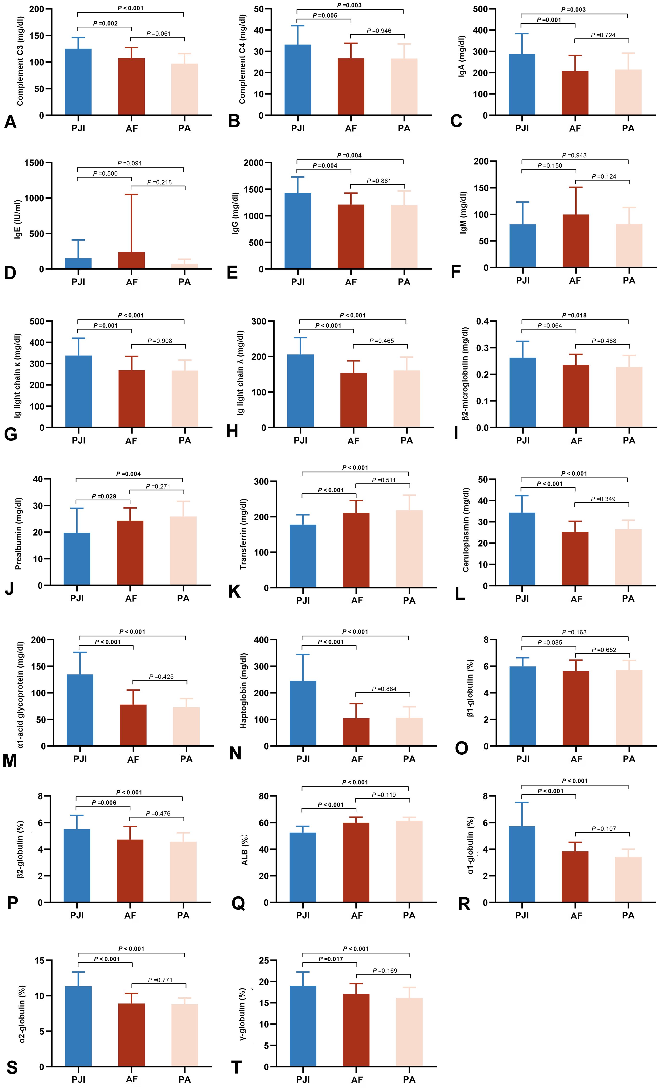 Figure 3. Comparison of peripheral immune-related proteins in the three groups, including complements C3 (A) and C4 (B), Ig A (C), IgE (D), IgG (E), IgM (F), light chains κ (G) and λ (H), β2-microglobulin (I), prealbumin (J), serum transferrin (K), ceruloplasmin (L), α1-acid glycoprotein (M), haptoglobin (N), β1-globulin (O), β2-globulin (P), albumin (Q), α1-globulin (R), α2-globulin (S), and γ-globulin (T). PJI, periprosthetic joint infection; AF, aseptic failure; PA, primary arthroplasty.