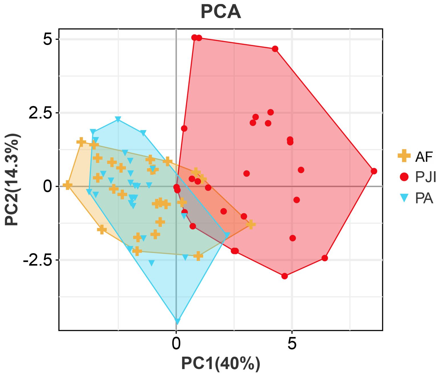Figure 4. Principal component analysis of immune parameters. PJI, periprosthetic joint infection; AF, aseptic failure; PA, primary arthroplasty.