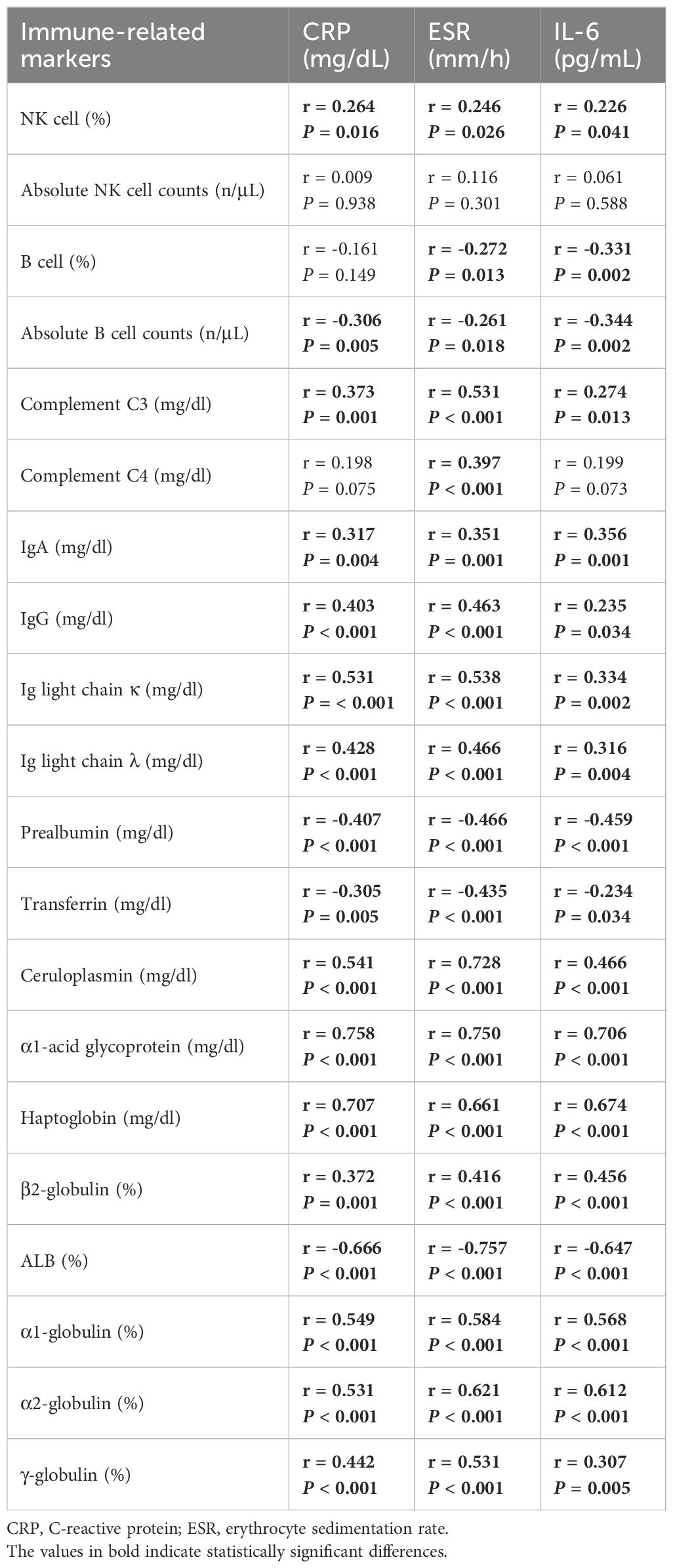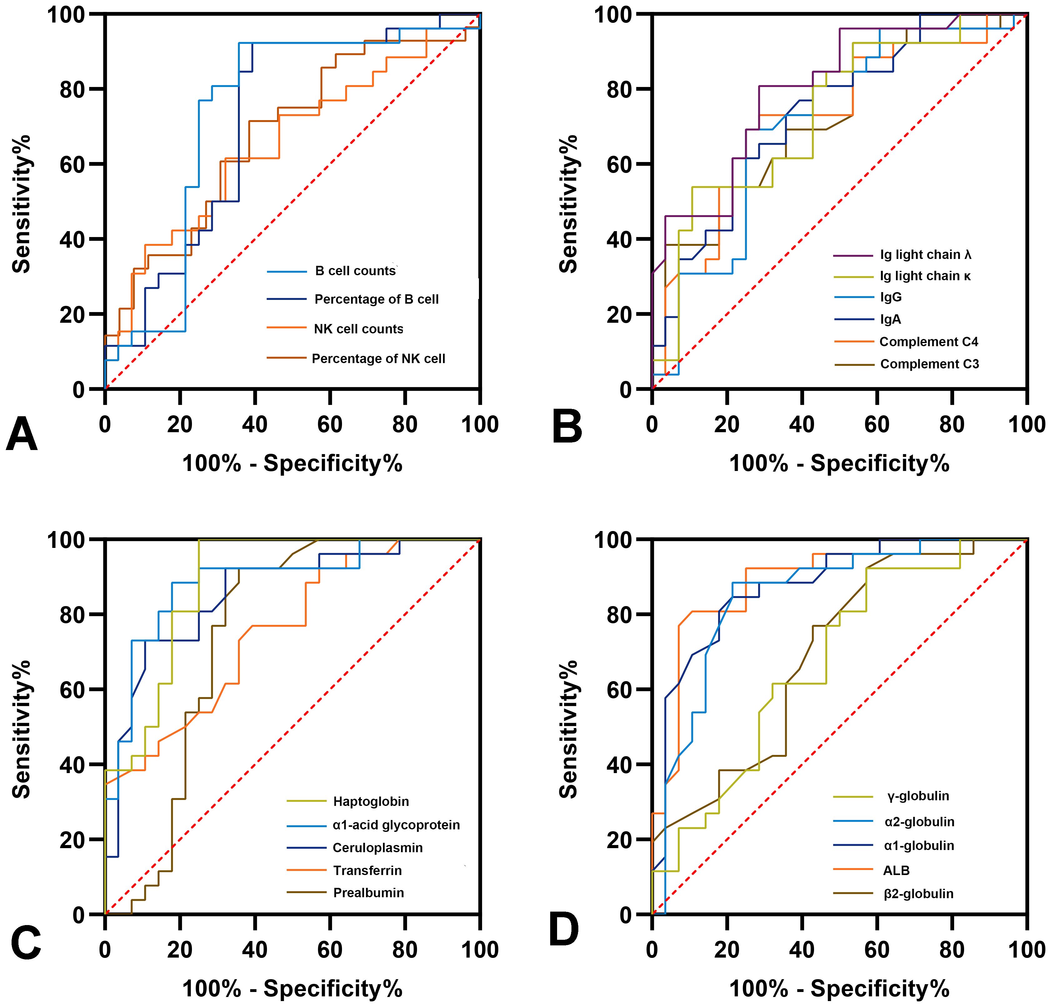 Peripheral venous blood samples were collected from all eligible patients on the morning of the second hospital day, following an overnight fast. Samples were promptly processed within thirty minutes of collection at the laboratory. No patients were receiving antimicrobial therapy at the time of sample collection. The immune and inflammatory markers that were tested included: (1) traditional inflammatory markers: C-reactive protein (CRP), erythrocyte sedimentation rate (ESR), and interleukin-6 (IL-6); (2) lymphocyte subpopulations: percentages and absolute counts of NK cells, B cells, T cells, CD3+/CD4+ T cells, CD3+/CD8+ T cells, and the CD4/CD8 ratio; (3) serum immune-related proteins: complements C3 and C4, immunoglobulins (Ig) A, IgE, IgG, IgM, light chains κ and λ, β2-microglobulin, prealbumin, serum transferrin, ceruloplasmin, α1-acid glycoprotein, haptoglobin, β1-globulin, β2-globulin, albumin (ALB), α1-globulin, α2-globulin, and γ-globulin. All of the above tests were routinely available at our institution. Flow cytometry was used for lymphocyte subpopulation analysis (BD FACSLyric™ Flow Cytometer), and nephelometry immunoassay was used for immune-related protein detection (Siemens BN™ II System). In addition, haptoglobin levels were measured in the validation group patients to further support the current data.