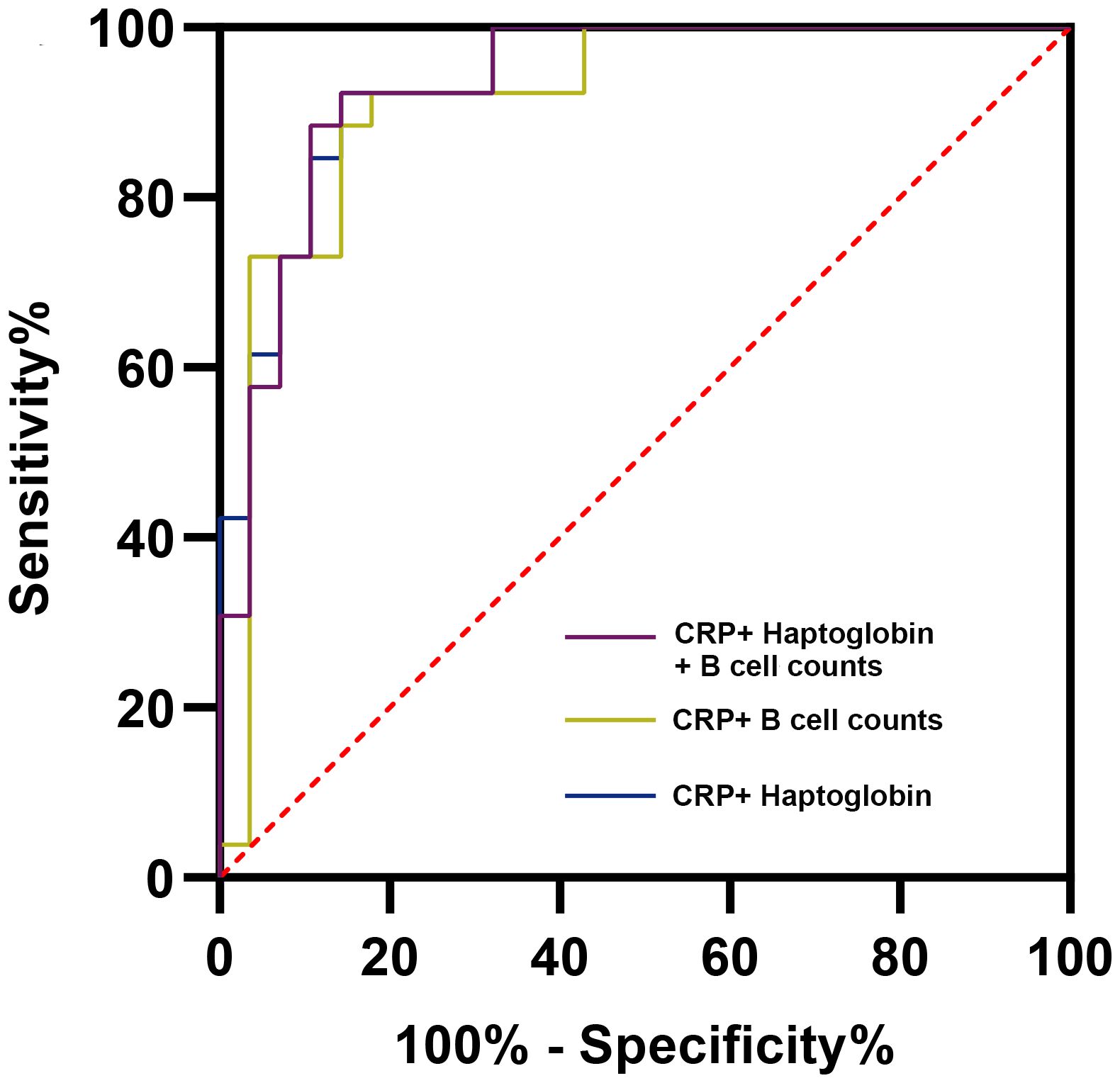 We evaluated various combinations and found that the combination of CRP and haptoglobin had the highest diagnostic efficacy (AUC = 0.937, 95% CI: 0.876-0.998), which was significantly better than the combination of CRP and ESR (AUC = 0.886, P = 0.025). In addition, CRP+B cell absolute counts demonstrated the best diagnostic ability in combinations that included lymphocyte subsets (AUC = 0.914, 95% CI: 0.831-0.996). These results indicated that the immune markers could further enhance the diagnostic ability of the serum indicators. Combining any three parameters did not further improve diagnostic accuracy (AUC for haptoglobin + CRP + B cell absolute counts was highest at 0.933, 95% CI: 0.866-0.999, Figure 6).