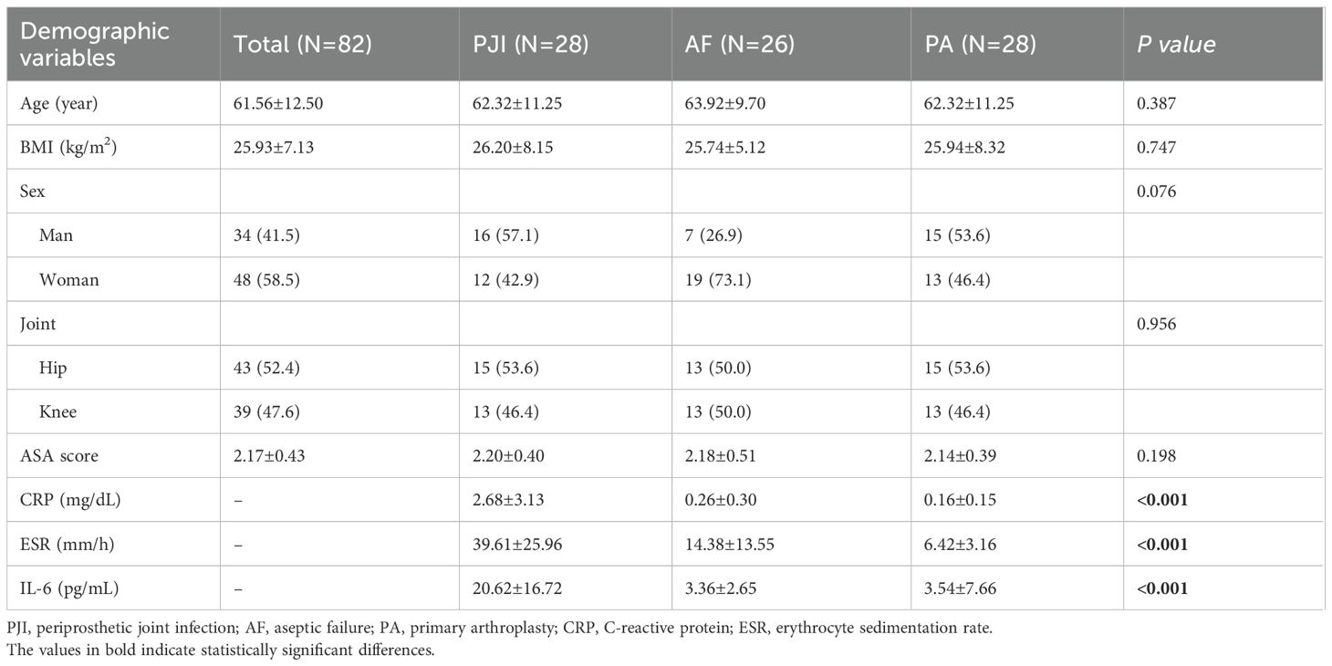 Ultimately, this prospective study included 82 patients, with the baseline characteristics detailed in Table 1. The average age of the PJI patients in this group was 62.32 ± 11.25 years, with 16 men and 12 women. No significant demographic differences were observed among the three groups (all P>0.05).