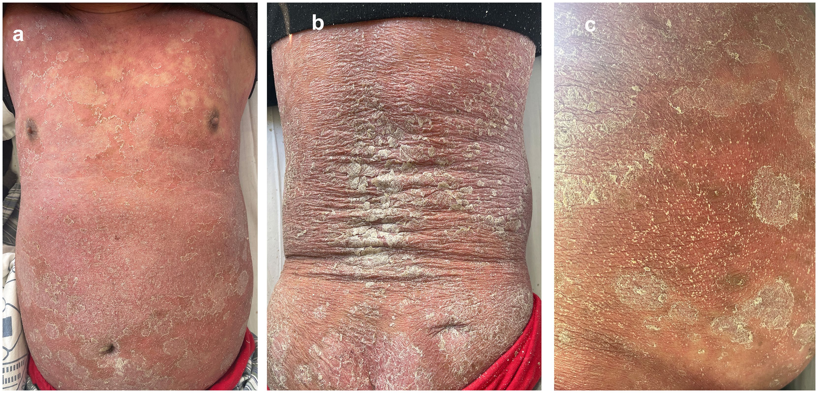 Figure 1. The patient present with diffuse erythema (a), severe desquamation (b) and pustules appeared on his neck, inner thighs, and abdomen (c) after self-medicating with metamizole (PASI 50.3).