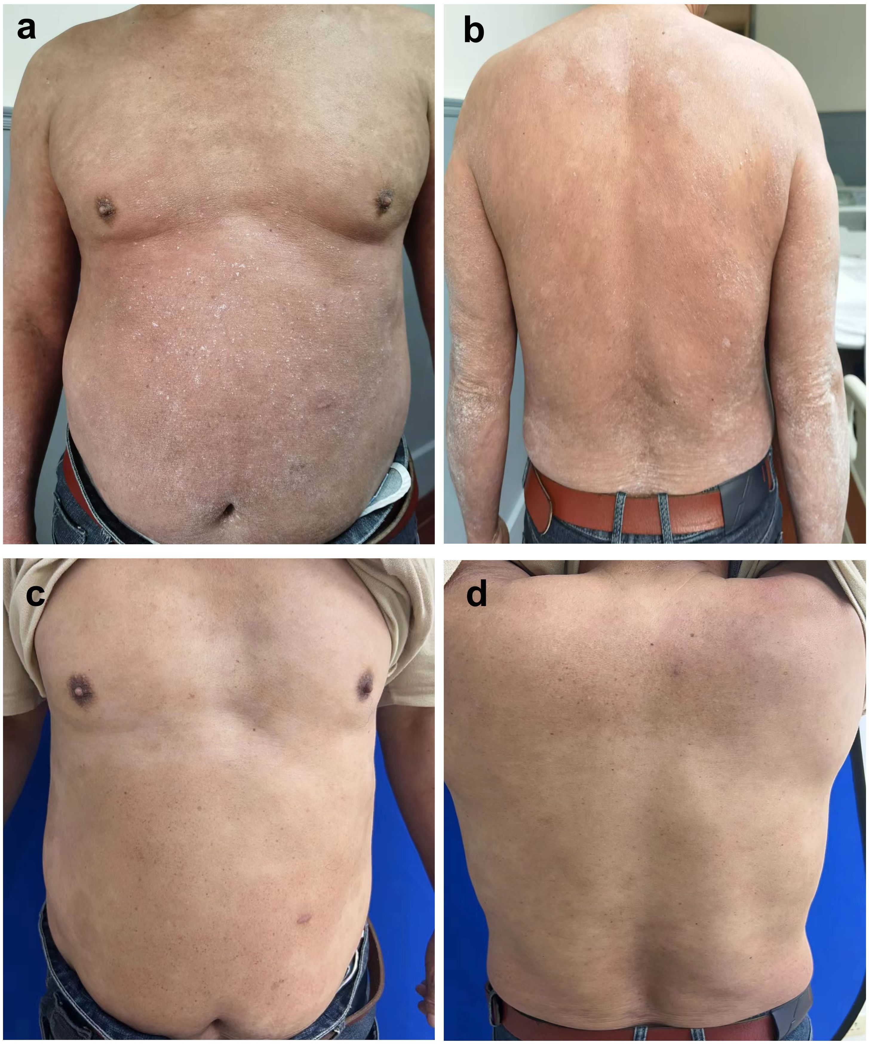 Due to the patient’s long history of psoriasis, the key differential diagnosis was GPP. The worsening of skin lesions coincided with the self-medication of metamizole three weeks ago due to a fever, suggesting a potential drug-induced reaction. Negative results for IL36RN and CARD14 gene mutations, which are often associated with GPP, help differentiate AGEP from GPP (5). According to the EuroSCAR scoring system, which evaluates morphology, clinical course, and laboratory findings, the patient’s score was 8, indicating a definitive diagnosis of AGEP. The cornerstone of AGEP treatment is the prompt identification and discontinuation of the causative drug. Systemic corticosteroid treatment was not the first choice, because of the patient’s history of psoriasis. Recently, biologics have recently been reported to successfully treat AGEP (6–11). With the consent of the patient, we prescribed Secukinumab 300 mg by subcutaneous injection. Improvement was seen 1 day after the first dose of subcutaneous injection. Sustained improvements were seen 1 week after the first dose of subcutaneous injection, with the PASI score decreased to 11.8. Of note, there was resolution of the pustules and most erythema (Figure 2a, b). After discharge, the patient received monthly injections of Secukinumab 300 mg for seven months. The patient eventually achieved PASI 100 at 7 months of follow-up. All skin lesions have cleared (Figure 2c, d), with no recurrence to date. The patient remains under regular follow-up.