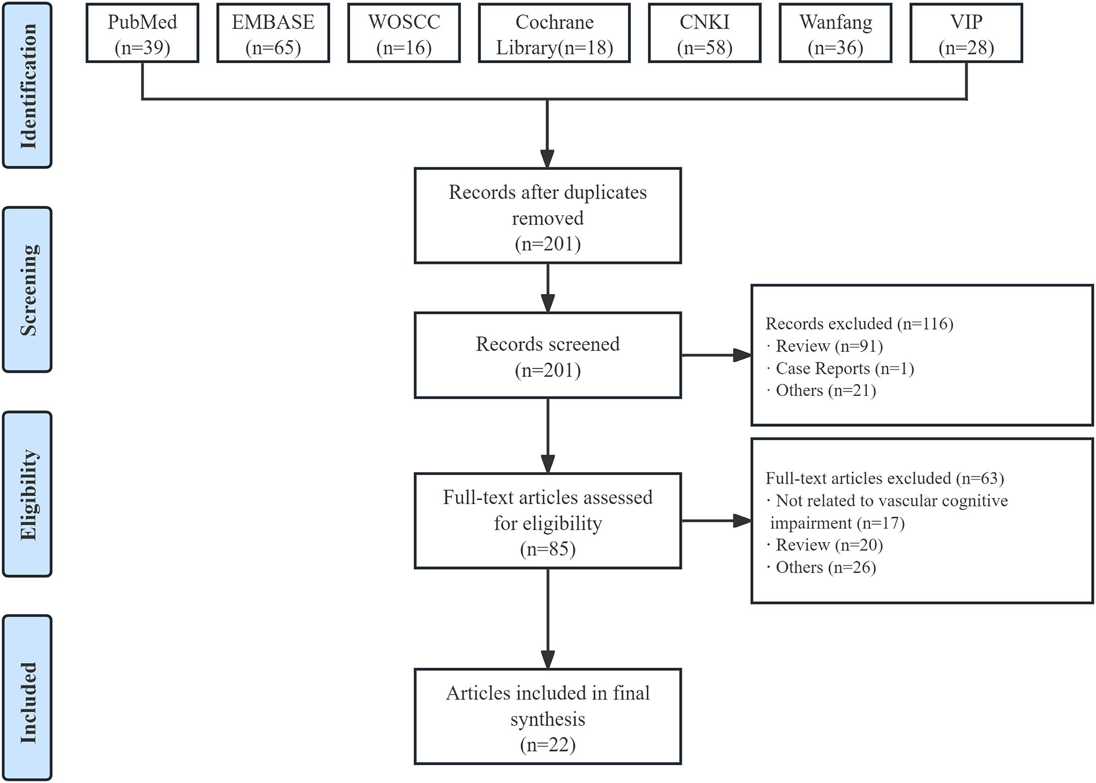 A total of 260 studies were retrieved through seven electronic database systems, with 59 excluded due to duplication. After screening titles and abstracts, 85 potentially relevant full-text articles were identified. Ultimately, 22 studies (19, 20, 22, 23, 27–44) were included in the final analysis (Figure 2).