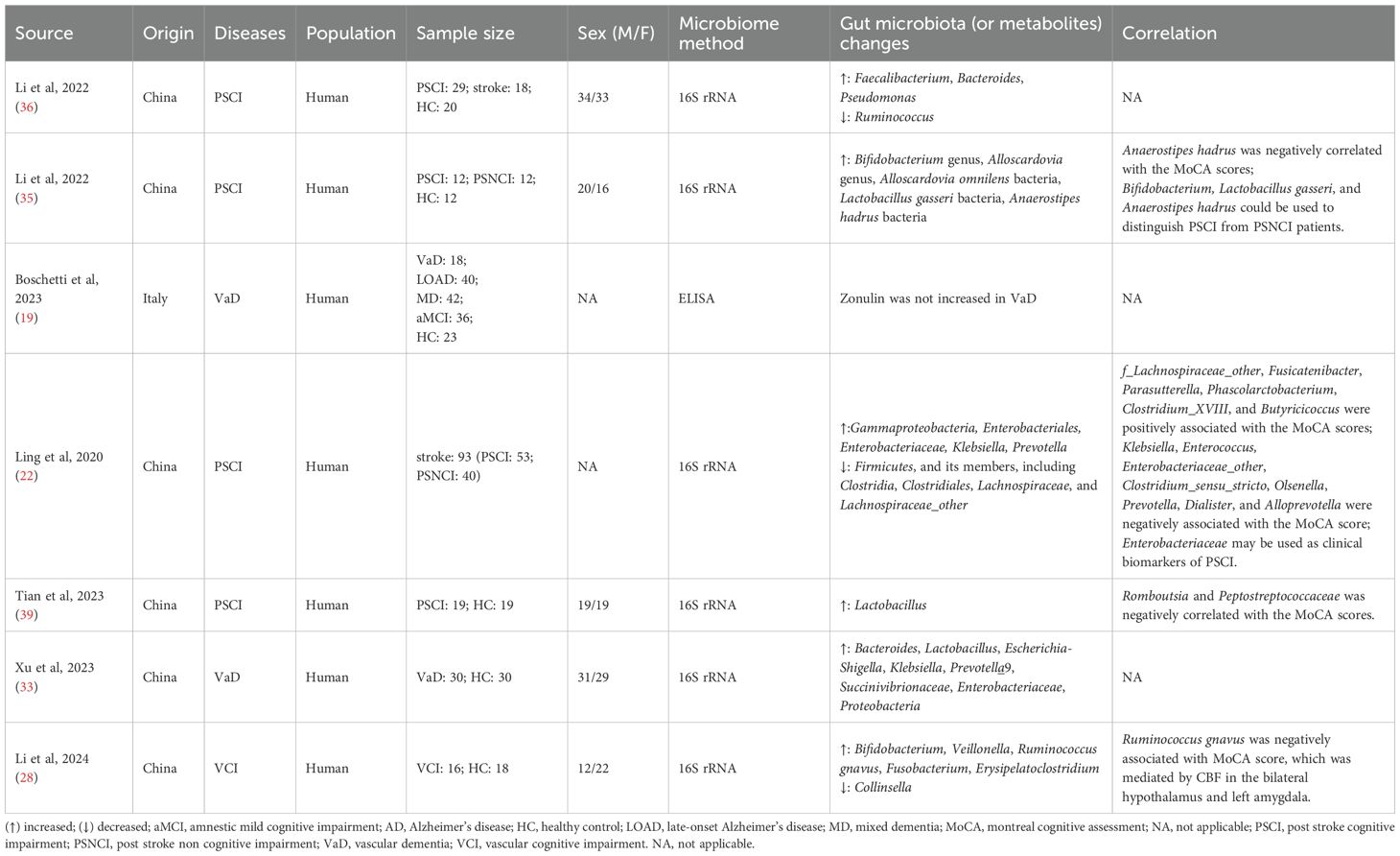 Four studies focused on the characteristics of gut microbiota in Chinese patients with post-stroke cognitive impairment (PSCI) and its relationship with cognitive function (22, 35, 36, 39). Through 16S rRNA sequencing of fecal samples, these studies consistently demonstrated significant structural alterations in the gut microbiome of PSCI patients. The timing of assessment varied across studies, with Li et al. and Tian et al. evaluating patients within one month post-stroke (35, 39), while Ling et al. extended the observation window to three months post-stroke (22). Notably, Li et al.’s study of 12 PSCI patients (5 females; mean age 60.75 ± 12.45 years) revealed increased abundance of Actinobacteria (Bifidobacterium, Alloscardovia, Alloscardovia omnilens) and Firmicutes (Lactobacillus gasseri, Anaerostipes hadrus) compared to post-stroke non-cognitive impairment (PSNCI) and control groups, with Anaerostipes hadrus showing a negative correlation with Montreal Cognitive Assessment (MoCA) scores (35). Tian et al.’s study of 19 PSCI patients (7 females; mean age 58.16 ± 7.81 years) demonstrated elevated Lactobacillus levels versus healthy controls, while Romboutsia and Peptostreptococcaceae were negatively associated with MoCA performance (39). Another study by Li et al. involving 29 PSCI patients (15 females; mean age 68.5 ± 9.9 years) observed increased conditional pathogens (Faecalibacterium, Bacteroides, Pseudomonas) alongside decreased beneficial bacteria like Ruminococcus when compared to stroke patients without cognitive impairment and healthy controls (36). Interestingly, Ling et al.’s longitudinal study of 135 ischemic stroke patients (with 93 analyzable at 3 months: 53 PSCI vs 40 PSNCI) found significantly reduced Firmicutes (Clostridia, Clostridiales, Lachnospiraceae, and Lachnospiraceae_other) and markedly increased Enterobacteriaceae abundance in the PSCI group (22). These distinct microbial patterns show promise as potential diagnostic biomarkers for PSCI monitoring and clinical management.