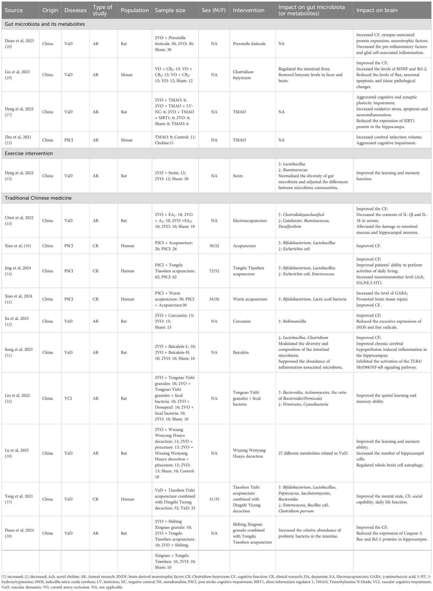 Currently, there are no effective and therapeutic approaches for VCI. Given the well-established brain-gut connection and particularly the crucial role of gut microbiota in VCI pathogenesis, growing research attention has been directed toward targeting the microbiota-gut-brain axis as a potential treatment strategy (20, 23, 27, 29). This section includes 15 studies, comprising four clinical trials and 11 experimental research. The overall risk of bias for clinical trials was rated as moderate (Supplementary Table S2). With the exception of one animal study that was judged to have an unclear risk of bias, all others were assessed as high risk (Supplementary Table S3). These studies explored diverse intervention approaches, including gut microbiota manipulation, exercise interventions, and traditional Chinese medicine (Table 2).