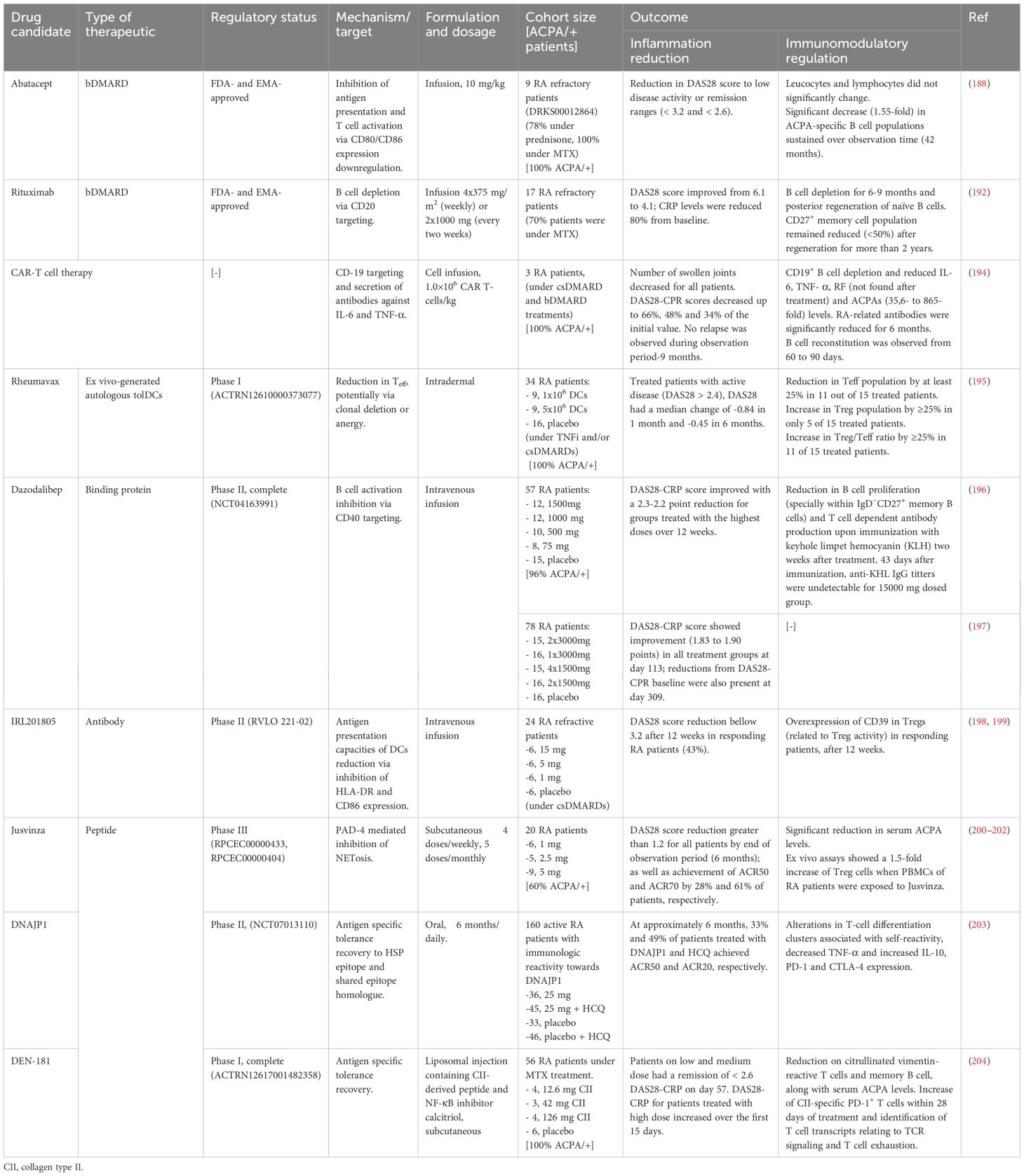 195. Benham H, Nel HJ, Law SC, Mehdi AM, Street S, Ramnoruth N, et al. Citrullinated peptide dendritic cell immunotherapy in HLA risk genotype-positive rheumatoid arthritis patients. Sci Transl Med. (2015) 7:290ra87. doi: 10.1126/scitranslmed.aaa9301