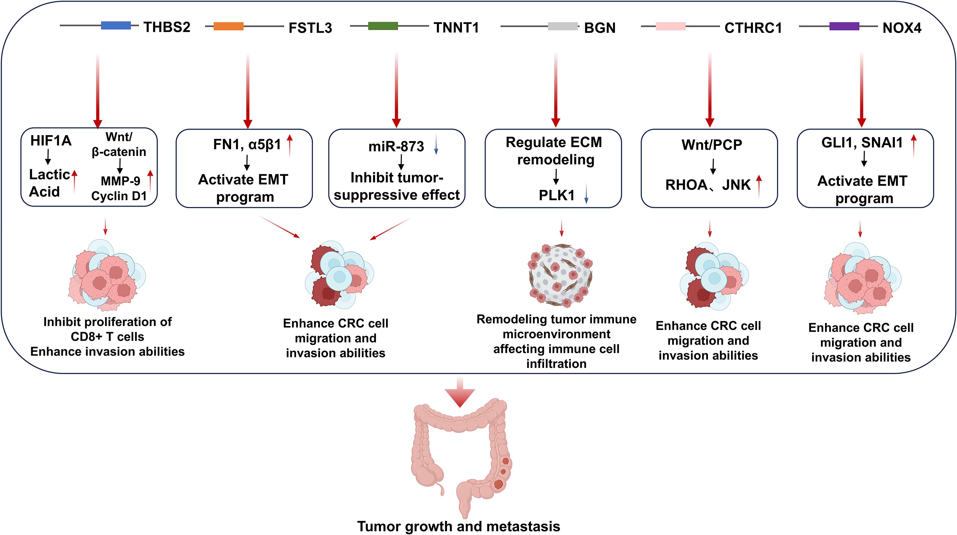 When designing effective mRNA vaccines targeting CRC, genes abnormally overexpressed in the cancer tissues of CRC patients can serve as ideal tumor-specific antigens (TSAs). According to the study by Liu et al. (18), CRC patients with high expression of six genes, THBS2, FSTL3, TNNT1, BGN, CTHRC1, and NOX4, exhibit shorter overall survival (OS) and shorter recurrence-free survival (RFS). Additionally, the expression levels of these six genes are associated with the infiltration levels of antigen-presenting cells (APCs) and T lymphocytes. Thus, in this study, we selected these six genes as ideal CRC-TSAs for mRNA vaccine development. Mechanistically, THBS2 promotes CRC metastasis by modulating the WNT/β-catenin signaling pathway while suppressing antitumor immunity through HIF1A/lactate/GPR132 axis interactions (19). FSTL3 drives epithelial-mesenchymal transition (EMT) via fibronectin1/α5β1 interactions and serves as a biomarker for extracellular matrix remodeling in CRC diagnosis (20). TNNT1 regulates EMT processes through miR-873-mediated mechanisms and functions as a prognostic indicator for colon adenocarcinoma (21). BGN has been reported to exert a significant impact on CRC cell proliferation, cell cycle progression, apoptosis, invasion, and migration (22). Previous studies have shown that knockout of BGN can inhibit the proliferation and migration of CRC cells (23). CTHRC1 enhances the proliferation and invasiveness of human CRC cells by activating the Wnt/planar cell polarity (PCP) signaling pathway (24). NOX4 regulates the expression of genes related to cancer cell biological behaviors, thereby promoting CRC cell proliferation, inhibiting apoptosis, and enhancing cell migration and invasion (25). The schematic diagram illustrating how the six aforementioned genes regulate the progression of colorectal cancer (CRC) is shown in Figure 1.