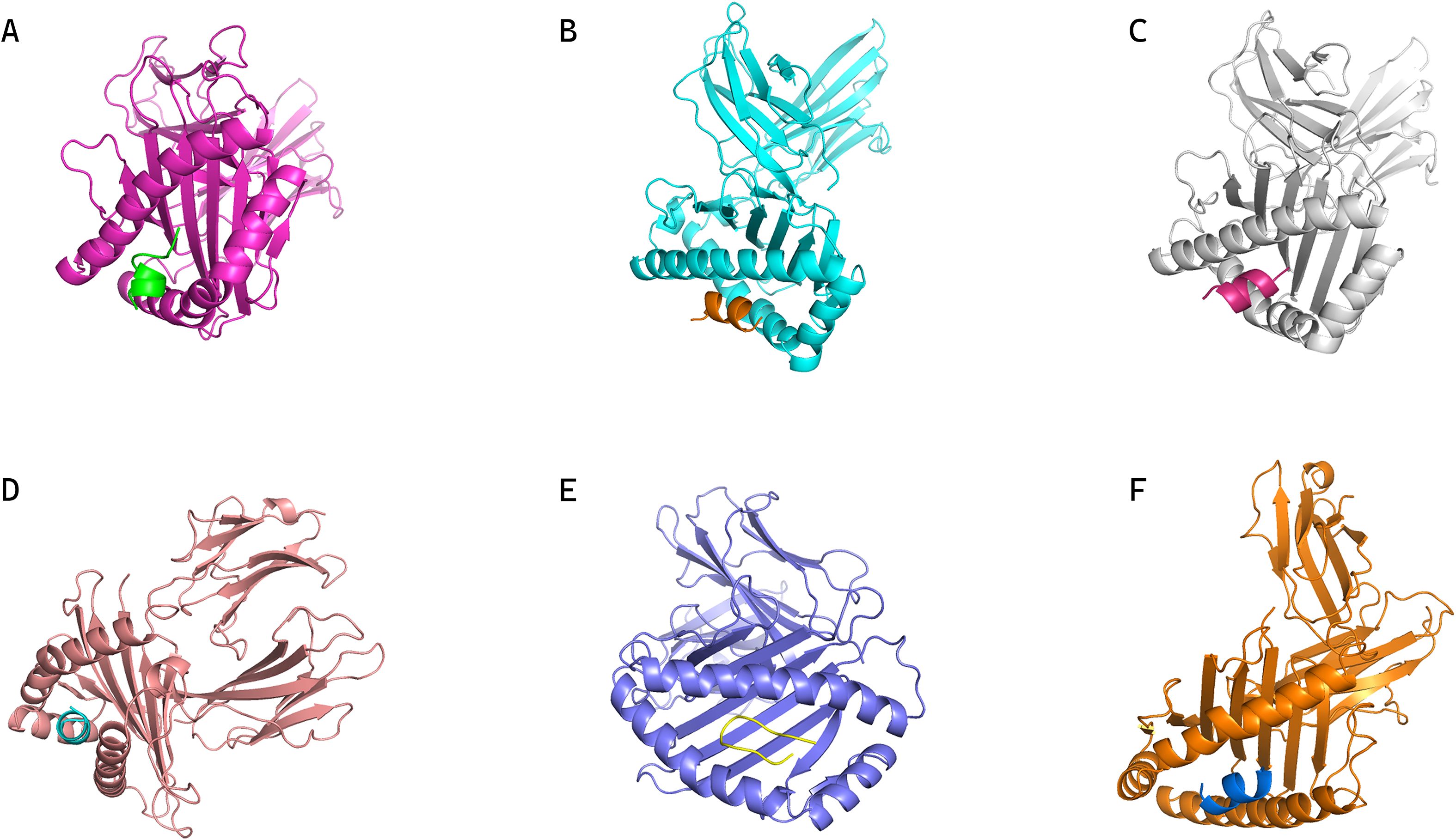 Figure 2. Conformations of epitopes bound to their corresponding MHC alleles from molecular docking. (A) Conformation of HLA-B35:01 in complex with epitope peptide DPDSVTPTY. (B) Conformation of HLA-B07:02 in complex with epitope peptide IPKGKQKAQL. (C) Conformation of HLA-A03:01 in complex with epitope peptide VMYRGRCRK. (D) Conformation of HLA-B35:01 in complex with epitope peptide SPFEESLNY. (E) Conformation of HLA-B57:01 in complex with epitope peptide RVSNDNQFLW. (F) Conformation of HLA-A01:01 in complex with epitope peptide MSDTEEQEY, which shows optimal binding (lowest I_sc and complete accommodation within the HLA binding groove) as supported by docking metrics.
