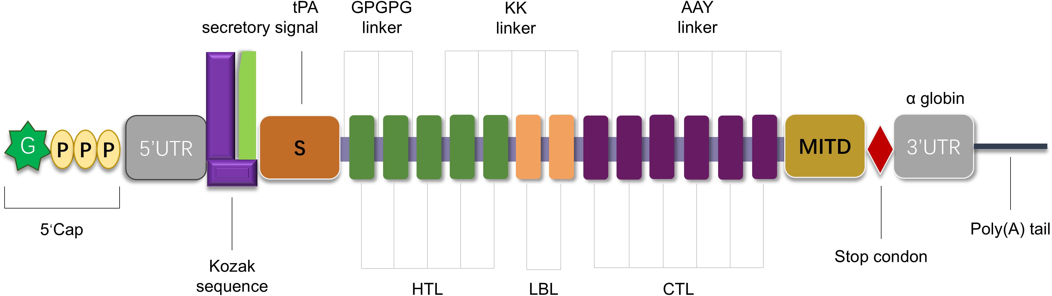 A potent mRNA vaccine construct requires systematic integration of five critical components (1): an open reading frame (ORF) encoding antigenic elements (2), the Untranslated Regions (UTRs) flanking the coding regions, (3) a Kozak sequence incorporating the start codon (GCCACCAUGG) to enhance translational initiation (37), (4) functionally optimized linkers, and (5) regulatory termination signals. The proposed construct features a 5’→3’ architecture comprising a modified 5′m7GCap structure, followed by an optimized 5’ untranslated region (5’UTR) and Kozak sequence to maximize ribosomal engagement. The ORF initiates with a signal peptide for intracellular trafficking, connected via an EAAAK rigid linker to helper T lymphocyte (HTL) epitopes interconnected through GPGPG spacers that maintain domain autonomy. This HTL cluster transitions via KK linkers to linear B-cell epitopes (LBL), followed by AAY-linked cytotoxic T lymphocyte (CTL) epitopes strategically positioned upstream of an MHC class I trafficking domain (MITD). The MITD sequence enhances immunogenicity through dual mechanisms: 1) optimizing antigen presentation efficiency via endosomal targeting motifs, and 2) directing vaccine components to antigen-processing compartments. Epitope segregation through GPGPG, KK, and AAY linkers ensures proper conformational folding while preserving immunological functionality. The construct terminates with a UAA stop codon, a stabilizing 3’ untranslated region (3’UTR), and a 120-nucleotide poly(A) tail to ensure mRNA stability and translational fidelity. This multi-layered design leverages structural bioengineering principles to balance epitope accessibility, intracellular trafficking efficiency, and immune activation capacity.