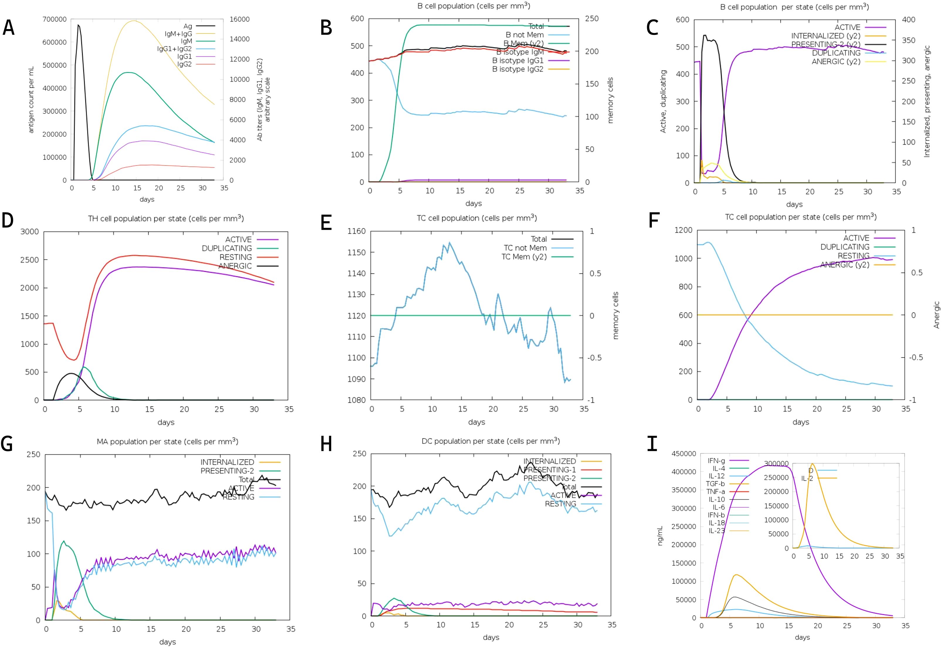 Figure 4. In silico immune simulation of the designed mRNA vaccine via the C-ImmSim server. (A) Kinetics of antigen count per nanoliter (black line, left y-axis), density of antibody-producing cells (Ab titers) per gram (gray line, right y-axis), and titers of immunoglobulins (IgM, IgM+IgG, IgG1+IgG2, IgG1, IgG2) over time post-immunization. (B) Total B cell population (cells per mm³, left y-axis) and memory B cell counts (right y-axis) following three vaccine doses. (C) Dynamics of B cell populations across distinct functional states over time. (D) Distribution of helper T (Th) cell populations across different states during the immune response. (E) Total cytotoxic T (TC) cell population (cells per mm³, left y-axis) and relative change in memory TC cells (right y-axis) over time. (F) Kinetics of TC cell populations across various states post-vaccination. (G) Dynamics of macrophage (MA) populations across different states during the simulation period. (H) Changes in dendritic cell (DC) populations across distinct states over time. (I) Production levels of cytokines and interleukins (IFN-γ, IL-4, IL-12, TGF-β, IL-10, IFN-β, IL-6, IL-1β, IL-23, IL-2) in nanograms per milliliter (ng/mL) during the 35-day simulation.