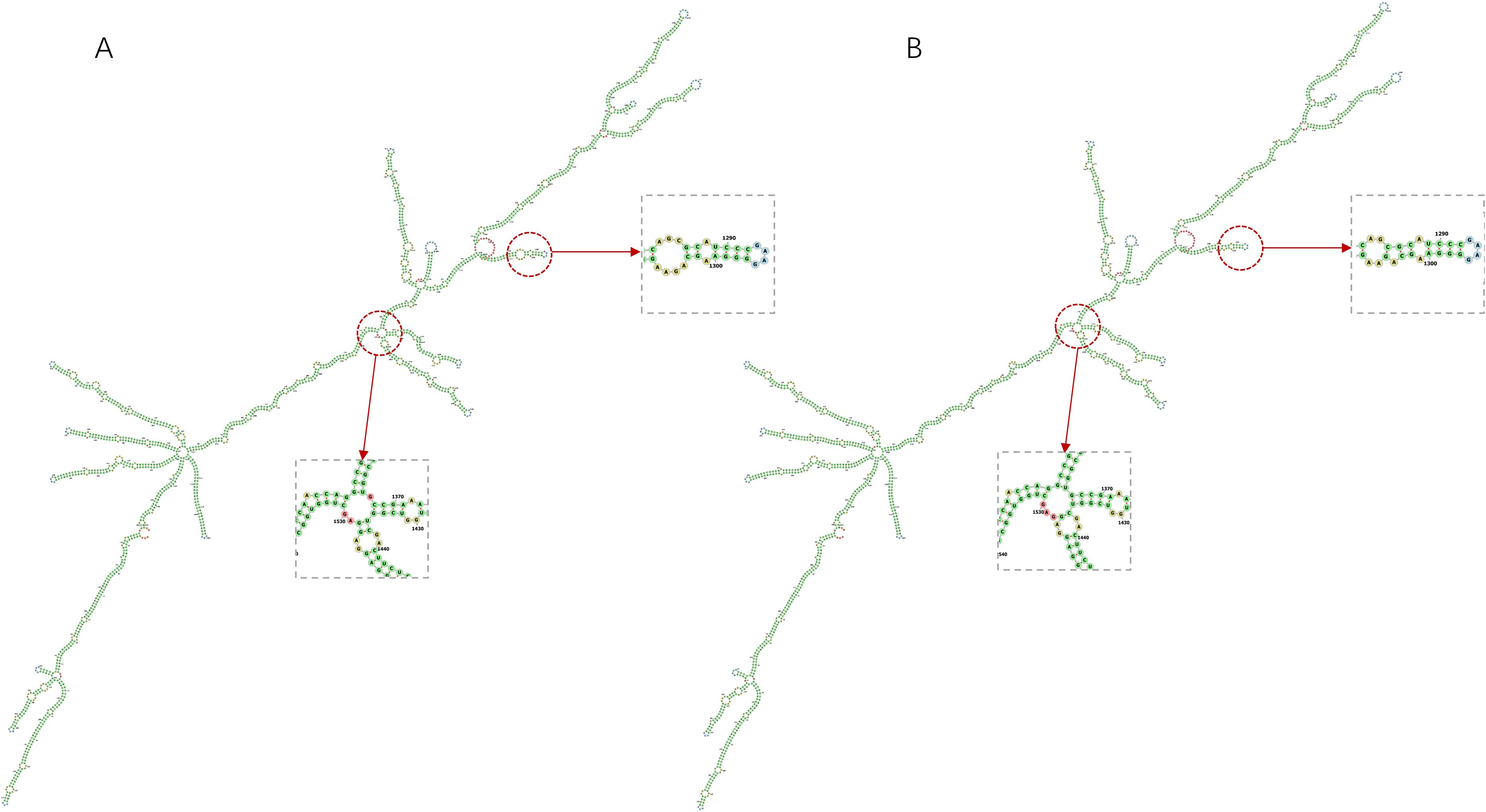 Figure 5. Prediction of the secondary structures of mRNA vaccine construct by two methods and their subtle differences in structural composition. (A) The secondary structure of the mRNA vaccine construct predicted by LinearDesign. (B) The secondary structure of the mRNA vaccine construct predicted by RNAfold.
