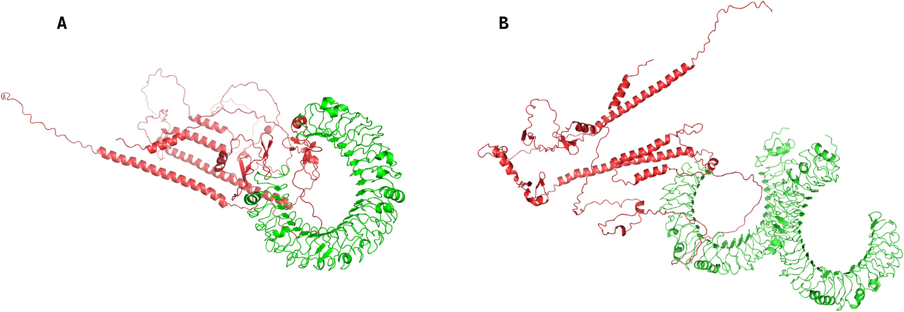 Figure 6. Protein-peptide docking complexes of the vaccine-encoded epitope with human Toll-like receptors, generated via ClusPro 2.0. (A) Docked complex between the vaccine-encoded peptide and Toll-like receptor 3 (TLR3; PDB ID 1ZIW). (B) Docked complex between the vaccine-encoded peptide and Toll-like receptor 4 (TLR4; PDB ID 3FXI).