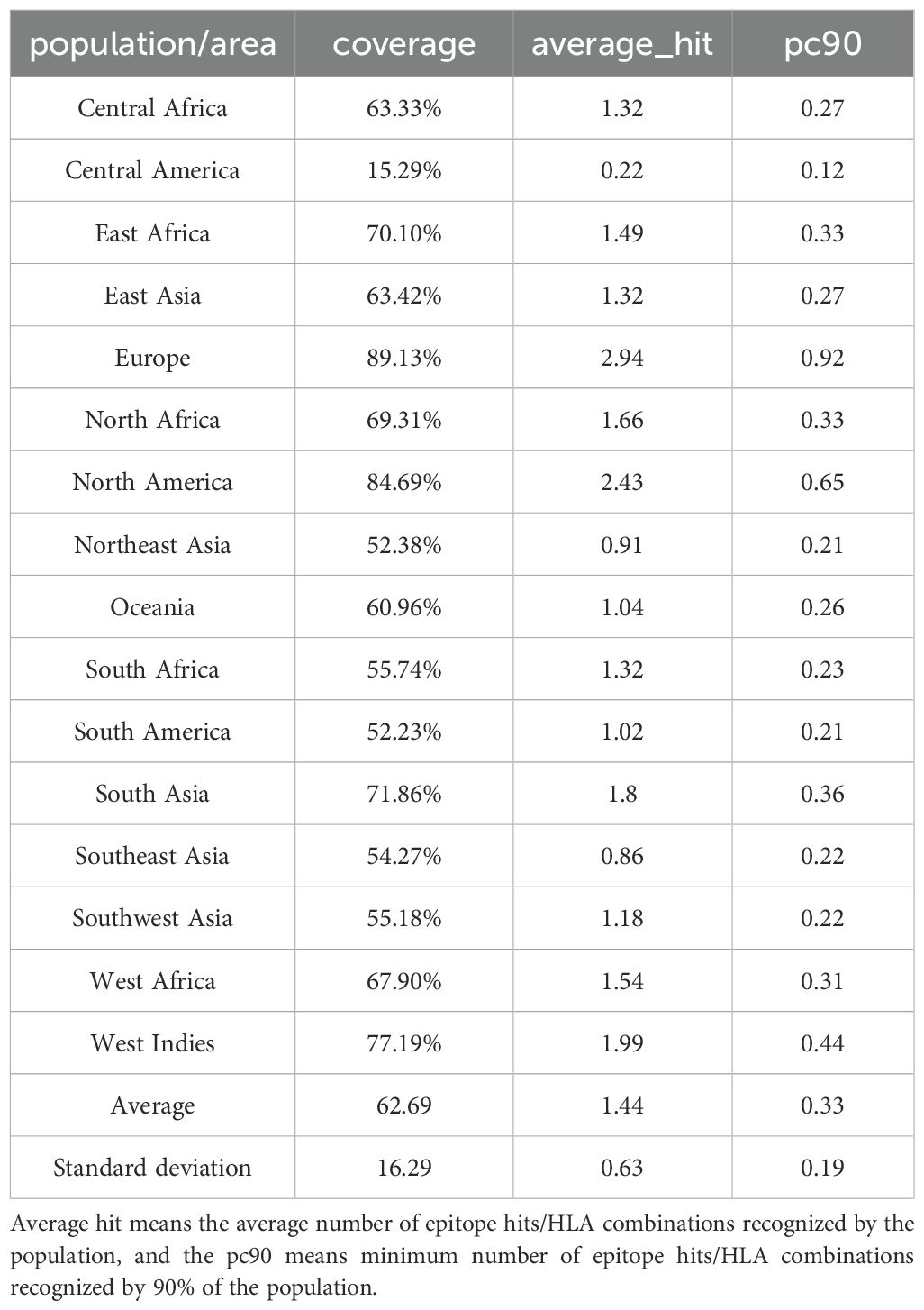 Population coverage analysis revealed geographical immunogenic efficacy disparities, with peak coverage in Europe (89.13%) and North America (84.69%) versus reduced efficacy in Central America (15.29%) (Table 1). This heterogeneity reflects regional HLA allele distribution patterns, necessitating future iterations incorporating population-specific HLA haplotypes for global applicability.