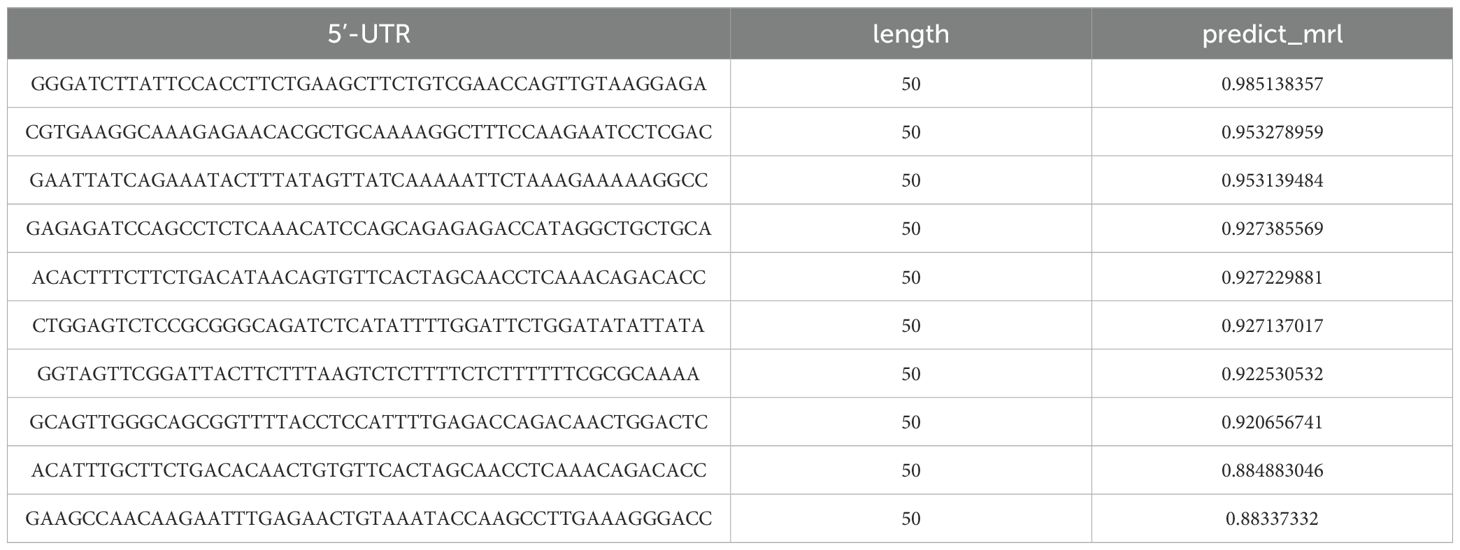 Our 5′-UTR candidate pool integrates four distinct sources: 1) 212 variable-length sequences from Chu et al. (34), 2) 8 Kozak sequence-containing variants from Li et al. (35), 3) The 5′-UTR of human α-globin genes, and 4) the 5′-UTR of BNT162b2(SARS-CoV-2 vaccine, from Pfizer/BioNTech) (36).