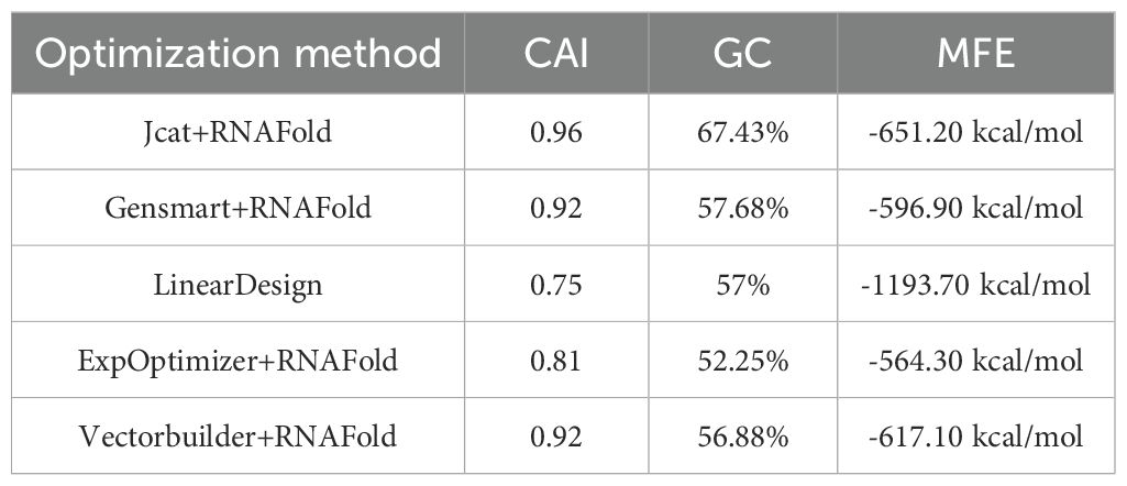 Table 4. Comparison of five codon optimization methods for mRNA vaccine sequences: Evaluation via CAI (Codon Adaptation Index, reflects translation efficiency), GC content (impacts mRNA stability and immunogenicity), and mRNA Secondary Structure MFE(minimum free energy, indicates mRNA secondary structure stability).
