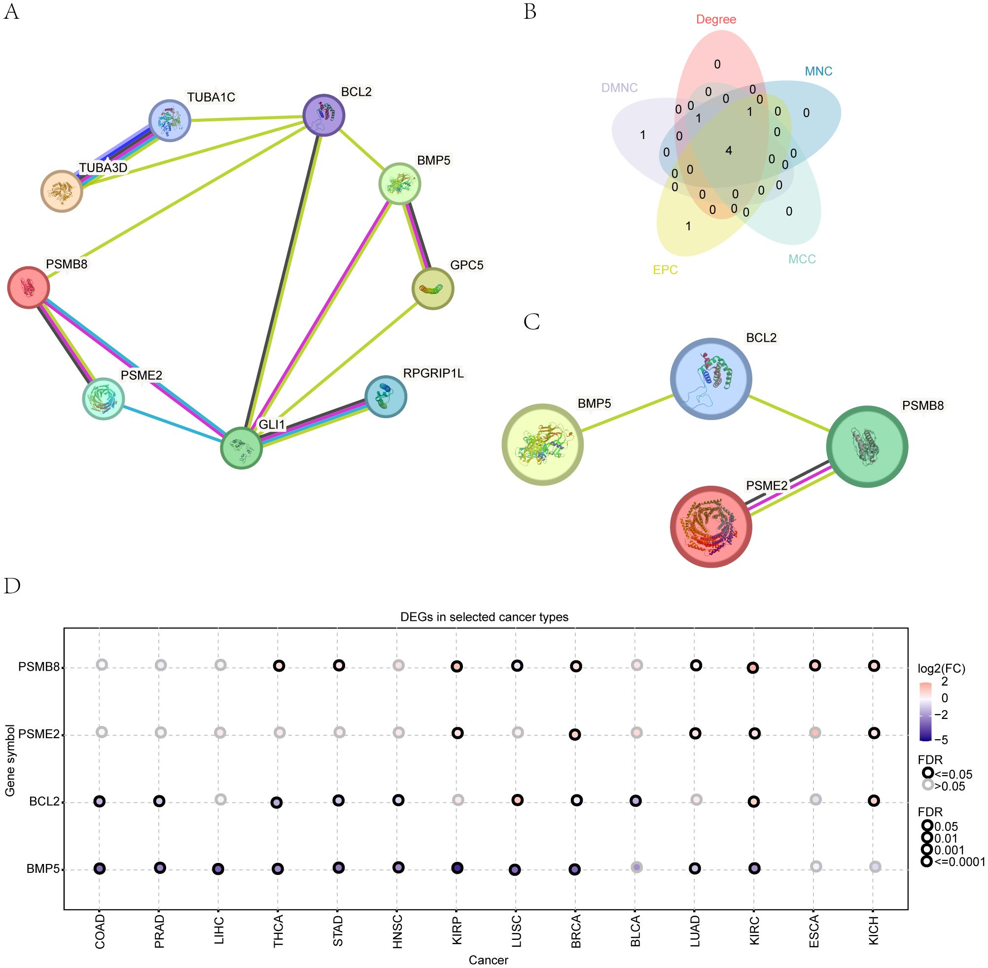 The interaction relationships among the genes were visually represented using Cytoscape software (Figure 1A). We employed the cytoHubba plug-in to analyze five algorithms (MCC, DMNC, EPC, Degree, and Closeness), identifying the top four HRDEGs—PSMB8, BCL2, BMP5, and PSME2—as essential genes (Figures 1B, C). Using the GSCA online tool, we examined the expression patterns of these genes across 14 cancer types, which required a minimum of three tumor samples alongside their normal counterparts (Figure 1D and Table 1). The results indicated a consistent decrease in BCL2 and BMP5 expression in most tumor samples, while PSMB8 and PSME2 showed increased expression.