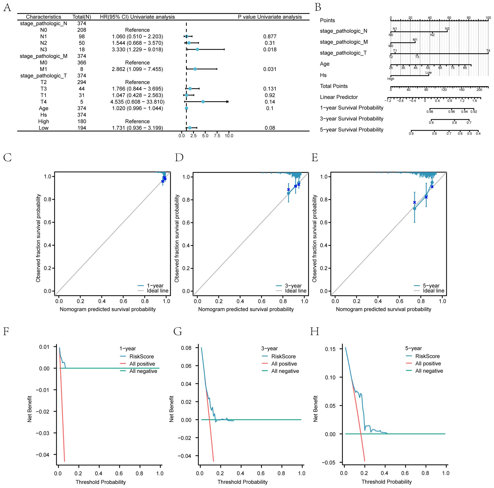 The calibration graph illustrates high accuracy at 1, 3, and 5-year intervals, showing strong concordance between estimated and observed OS values (Supplementary Figures 12C–E). The practical utility of the Hs prediction model was evaluated through Decision Curve Analysis (DCA) for one year (Supplementary Figure 12F), three years (Supplementary Figure 12G), and five years (Supplementary Figure 12H). The analysis indicates that the 5-year model offers greater clinical value than the 3-year model, with the 1-year model demonstrating the highest practicality.